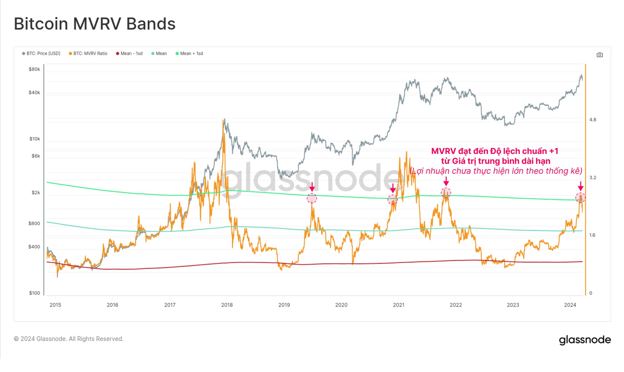 Thị trường Bitcoin đã tăng lên mức ATH mới trên 73.000 USD, gây ra sự gia tăng các sự kiện chốt lời của nhóm Người nắm giữ dài hạn. Thị trường hiện đang có lợi nhuận thực tế hơn 2,6 tỷ USD/ngày, cho thấy nhiều nhà đầu tư đã bắt đầu hiện thực hoá một phần lợi nhuận. Tuy nhiên, đây không phải là hành vi thị trường không điển hình và rất giống với các mô hình thị trường được quan sát thấy trong tất cả các đợt phá vỡ ATH của các chu kỳ trước đó.