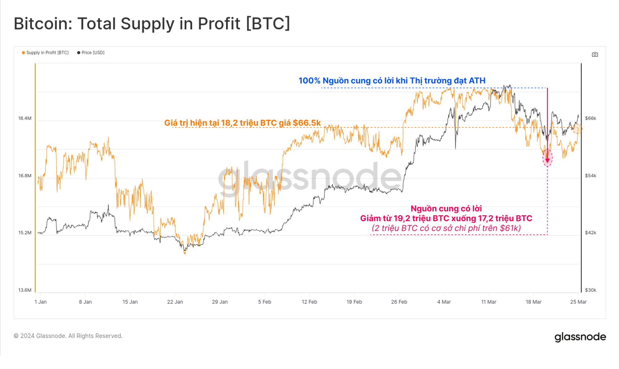 Khi thị trường phục hồi trở lại mức 66.500 USD, khoảng 1 triệu BTC đã trở lại trạng thái “có lời”. Từ hai quan sát này, chúng tôi có thể xác định rằng: