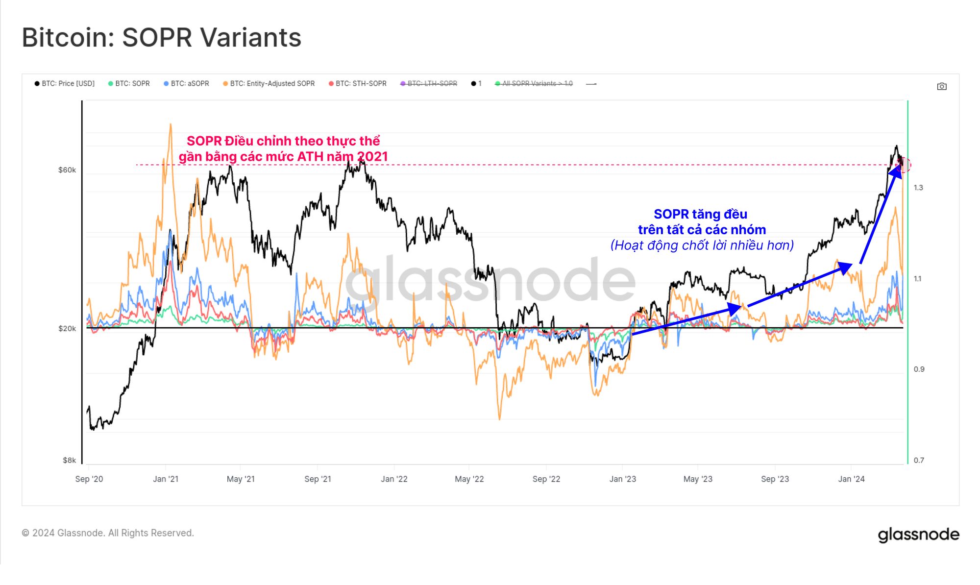 Phần lớn trong số 2 triệu BTC này hiện có cơ sở chi phí trên 61.200 USD và đã đổi chủ gần đây khi các chủ sở hữu trước đó chi tiêu chúng để thu lại lợi nhuận. Biểu đồ bên dưới trình bày một loạt các biến thể của SOPR, là số liệu mô tả hành vi lợi nhuận thực tế này.