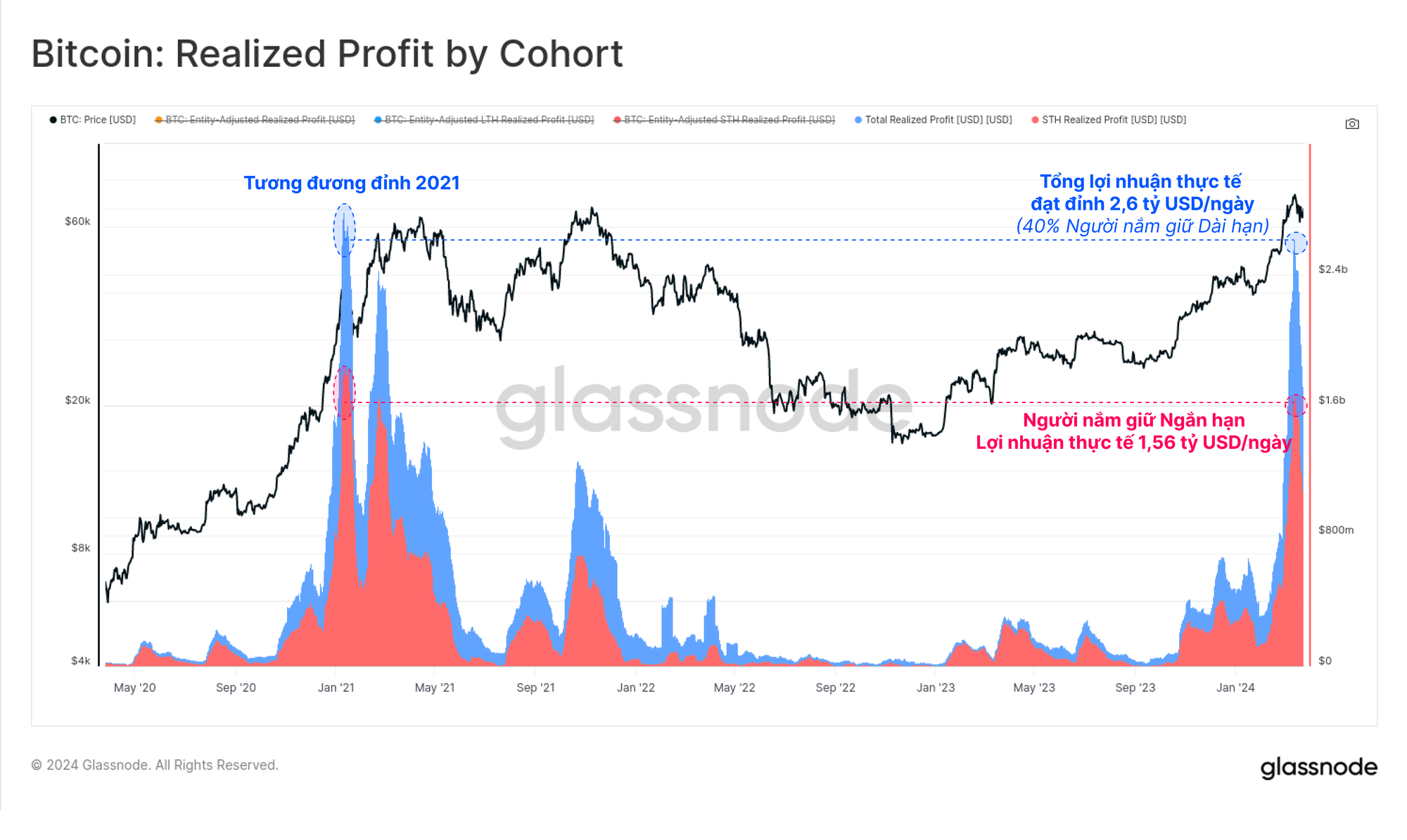 Phần lợi nhuận 1,56 tỷ USD còn lại được hiện thực hoá bởi những Người nắm giữ ngắn hạn khi các nhà giao dịch tận dụng thanh khoản đang chảy vào và động lượng thị trường. Lợi nhuận thực tế của cả hai nhóm đã đạt mức tương tự như đỉnh điểm của thị trường tăng giá năm 2021.