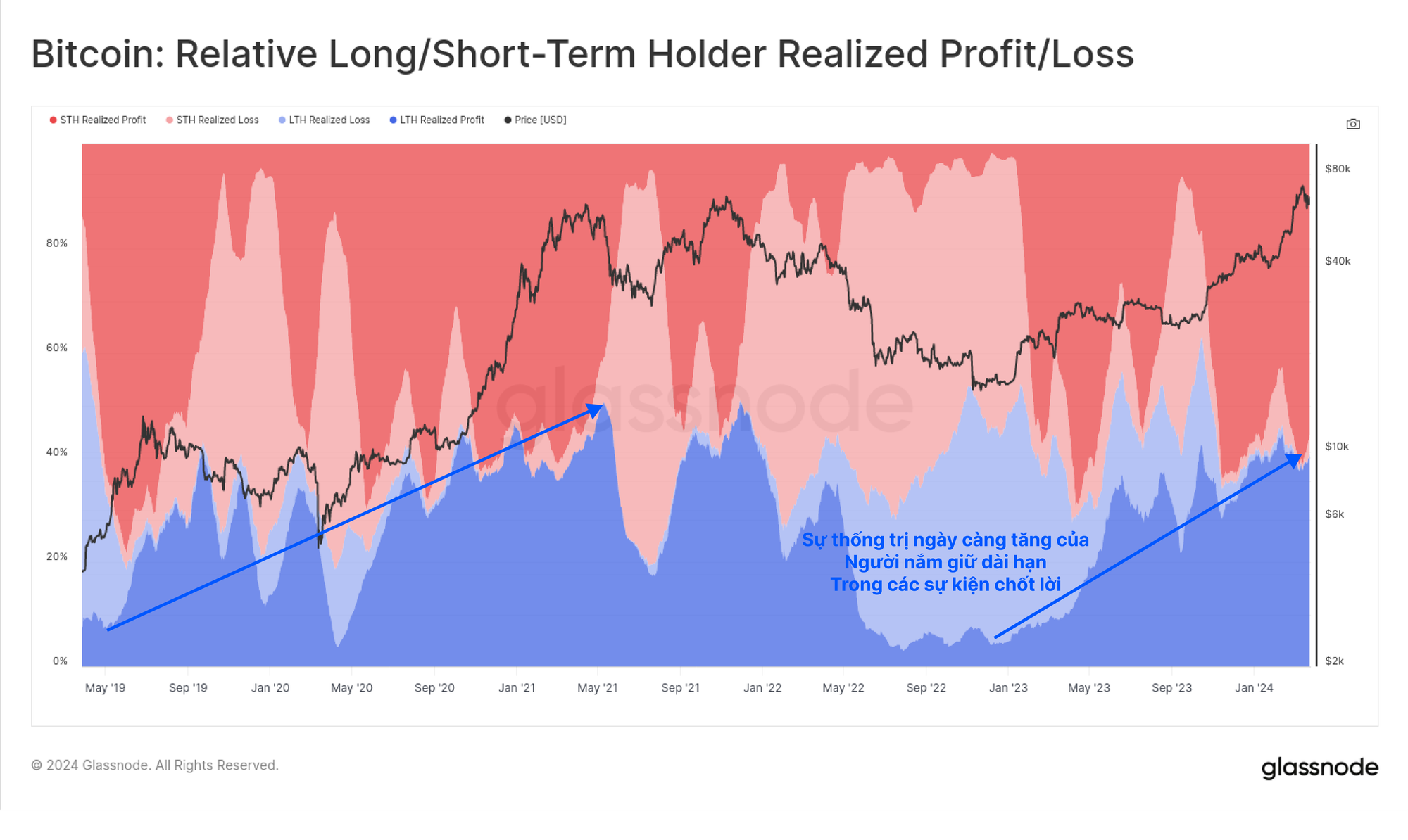 Chúng ta cũng có thể thấy sự thống trị của nhóm Người nắm giữ dài hạn đang tăng lên trong tất cả các sự kiện chốt lời. Điều này phù hợp với báo cáo trước đây (WoC-11), trong đó chúng tôi ghi nhận mức chi tiêu LTH tăng lên khi thị trường bứt phá lên ATH mới.