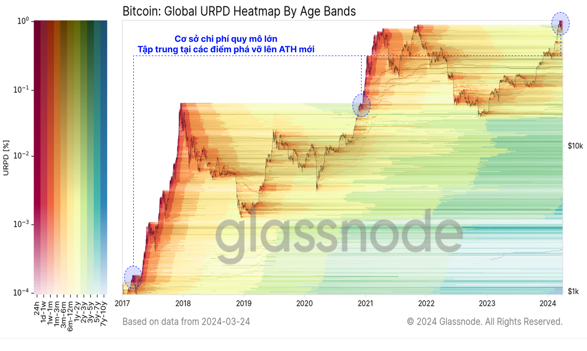 Cuối cùng, chúng ta có thể tham khảo một biểu đồ khá hấp dẫn, biểu thị các cụm nguồn cung Bitcoin theo thời gian và theo độ tuổi. Chúng tôi đã đánh dấu bằng màu xanh lam các điểm phá vỡ trước đó lên ATH mới, thúc đẩy quá trình chuyển đổi rõ rệt sang “nguồn cung nóng”.