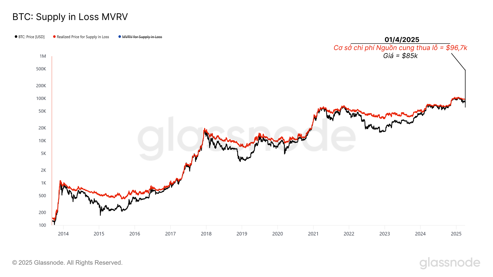 Phân tích toàn diện về thị trường giá giảm bao gồm hai khía cạnh chính: thua lỗ thống trị và cường độ thua lỗ. Thua lỗ thống trị được thể hiện qua số liệu Tổng nguồn cung Thua lỗ, số liệu này theo dõi khối lượng BTC được nắm giữ dưới giá mua on-chain của chúng. Vào ngày 30 tháng 3, 4,7 triệu BTC đã được giữ dưới mức cơ sở chi phí của chúng, đây là số lượng lớn nhưng vẫn thấp hơn các mức cực đoan được thấy vào giữa năm 2021, thị trường giá giảm năm 2022 và trong đợt giảm giá vào tháng 9 năm 2024.