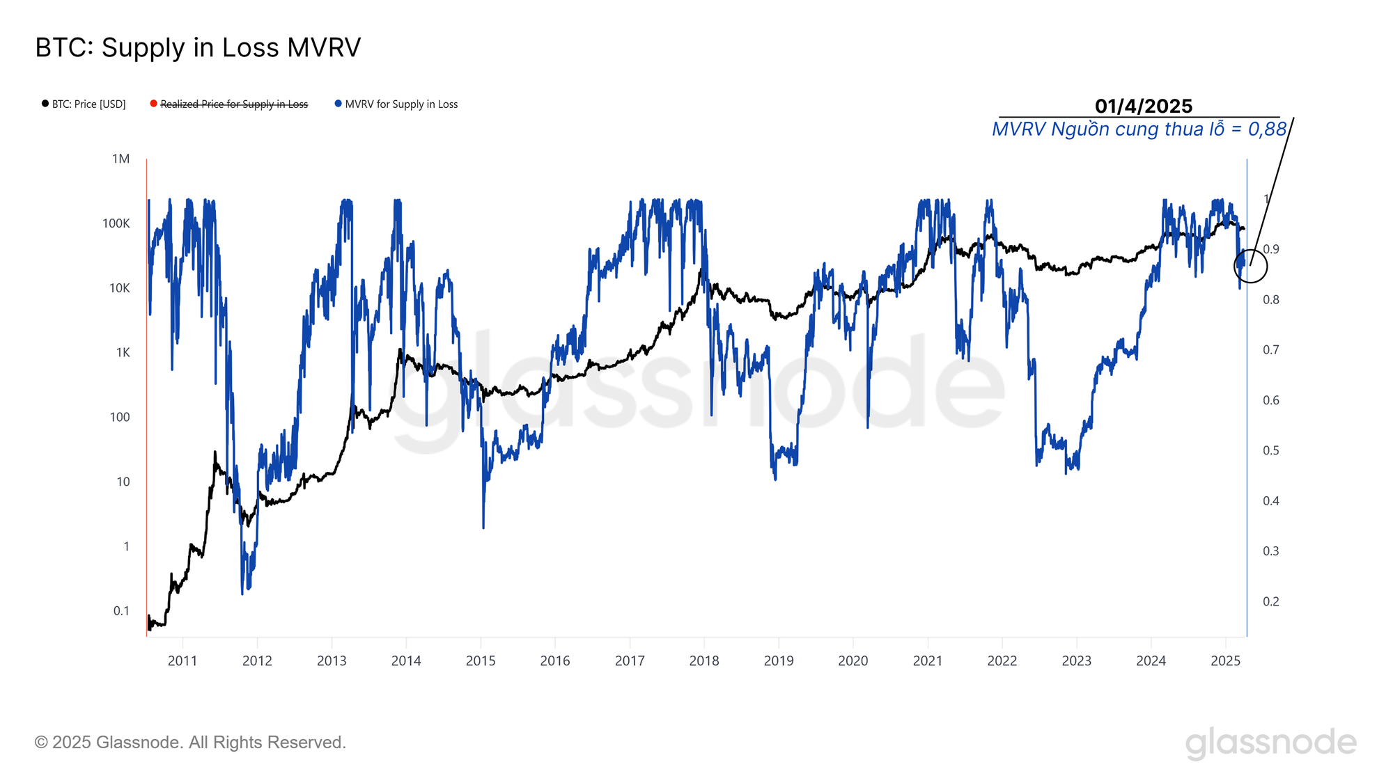 Để tách biệt các nhà đầu tư đang thua lỗ, chúng tôi có thể tập trung cụ thể vào MVRV của nguồn cung thua lỗ. Chúng tôi xây dựng số liệu này bằng cách chia tổng số thua lỗ chưa thực hiện được tính bằng USD mà thị trường nắm giữ cho số lượng BTC góp phần vào đó.