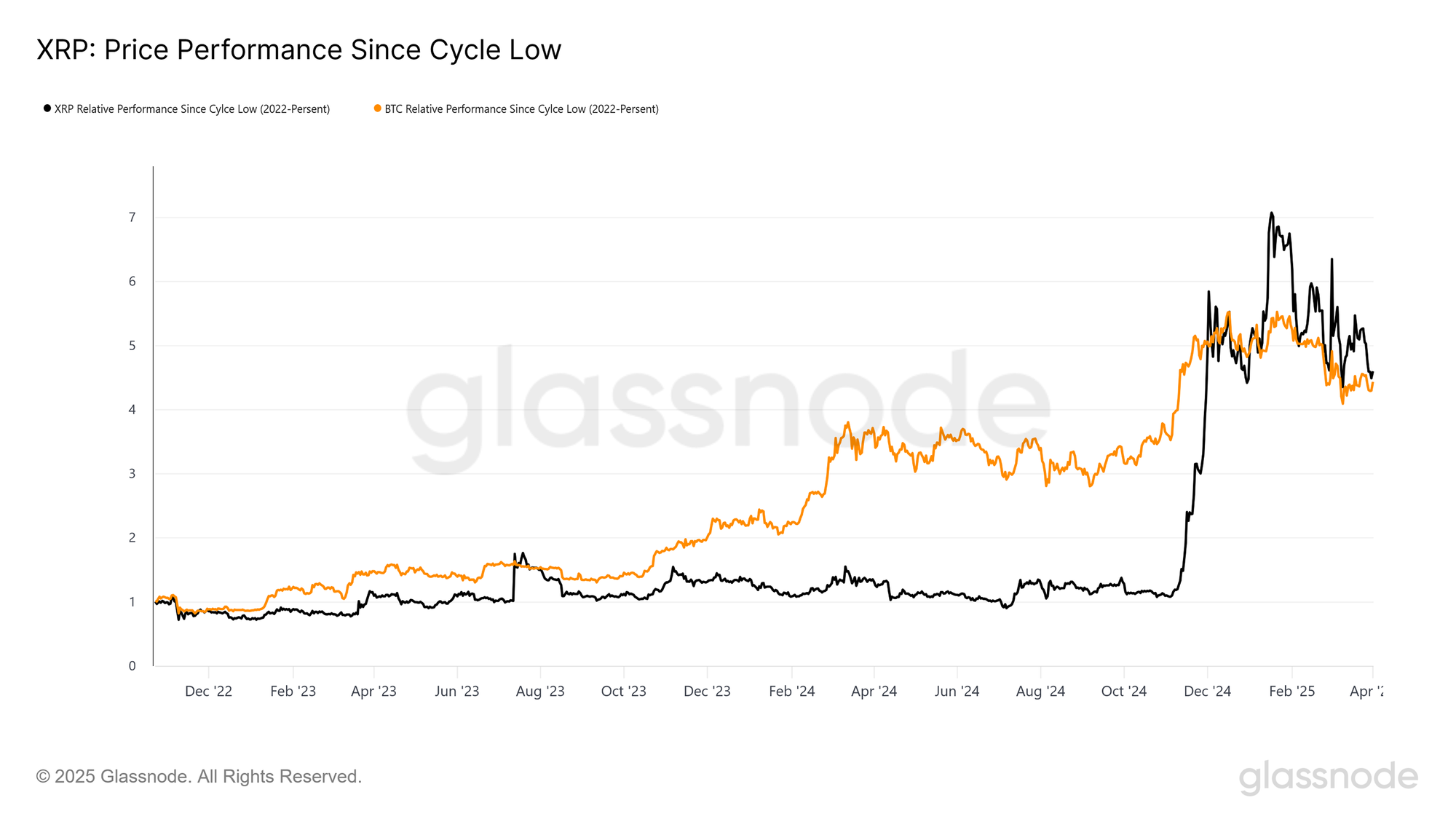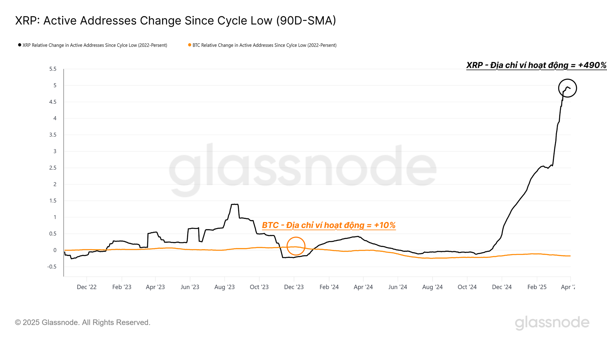 Kể từ đáy chu kỳ năm 2022, mức trung bình hàng quý của các địa chỉ ví hoạt động hàng ngày đối với XRP đã tăng +490% trong khi Bitcoin chỉ ở mức 10%. Sự tương phản rõ rệt này cho thấy sự nhiệt tình của nhà đầu tư cá nhân đã bị thu hút bởi XRP, do đó cung cấp sự phản chiếu cho nhu cầu đầu cơ trong không gian tiền mã hoá.