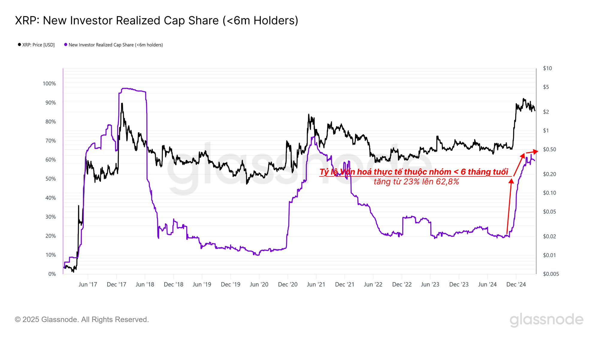 Bên cạnh sự gia tăng ngắn hạn trong dòng vốn, đã có sự tập trung của cải nhanh chóng vào tay các nhà đầu tư mới, với tỷ lệ vốn hóa thực tế của XRP, với thời gian dưới 6 tháng, đã tăng từ 23% lên 62,8% chỉ trong một thời gian ngắn.