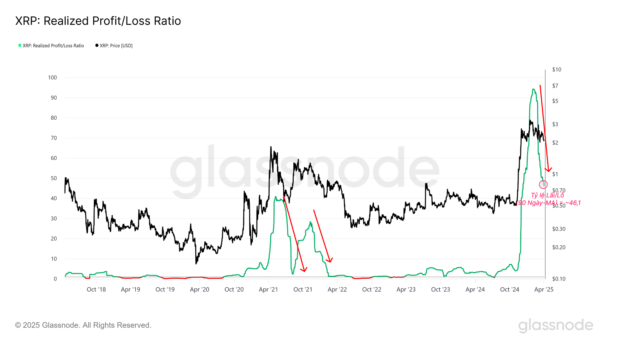 Nó giống với cấu trúc cơ sở chi phí mất cân bằng tại đỉnh, điều này trở nên đáng lo ngại hơn khi chúng tôi quan sát Tỷ lệ Lợi nhuận/Thua lỗ thực tế của XRP. Chỉ số này đã giảm đều đặn kể từ tháng 1 năm 2025, cho thấy các nhà đầu tư đang thu được ít lợi nhuận hơn và thua lỗ ngày càng lớn.
