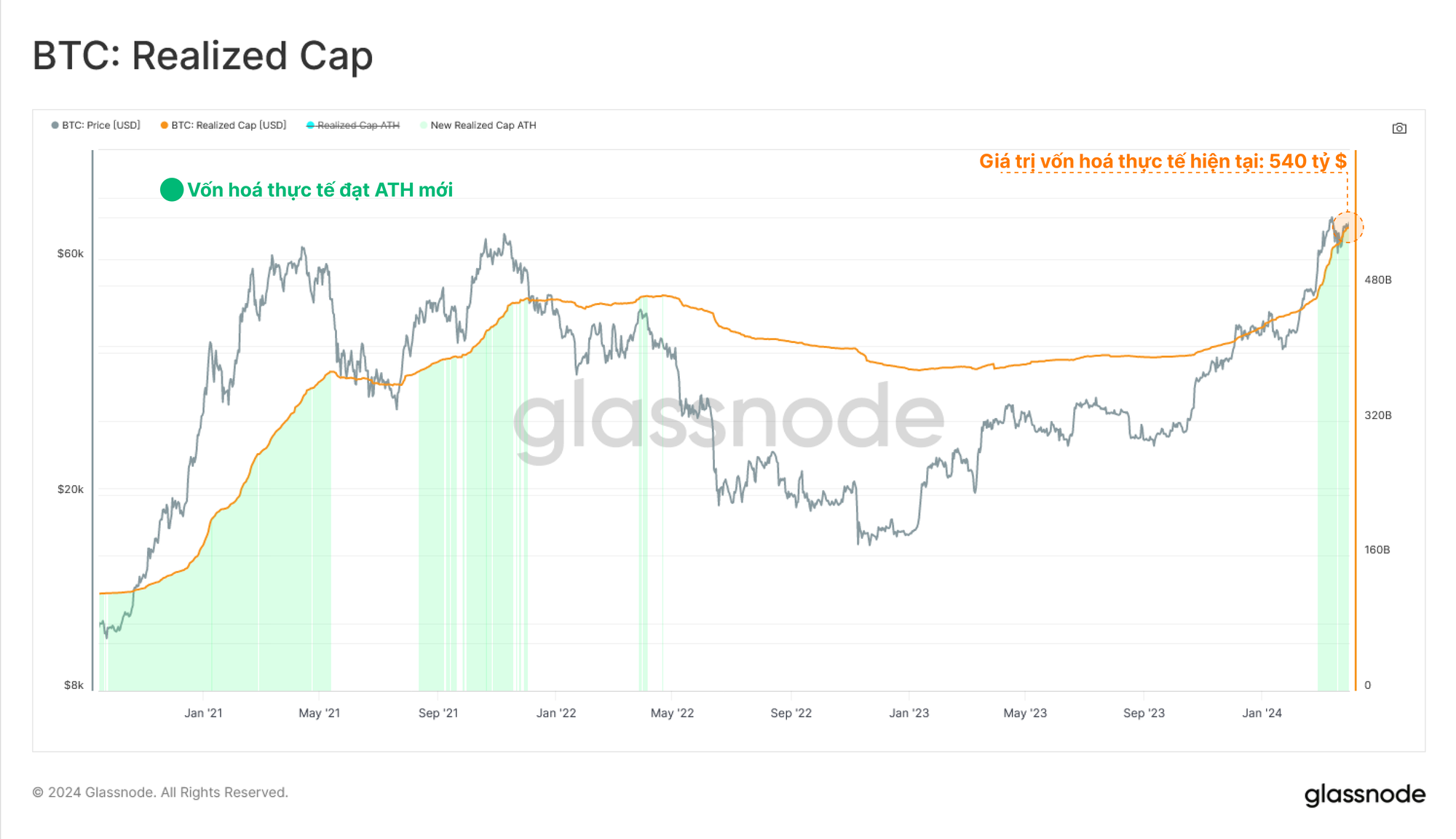 - Vốn tiếp tục chảy vào Bitcoin, với Vốn hoá thực tế tăng lên mức cao mới là 540 tỷ USD. Tốc độ dòng vốn chảy vào tài sản hiện đã vượt quá 79 tỷ USD/tháng.