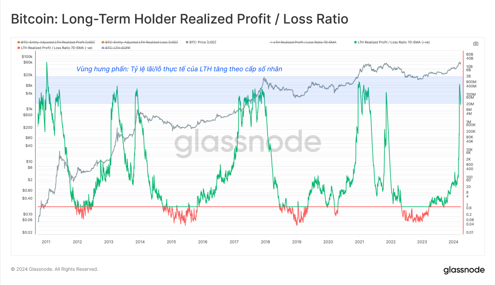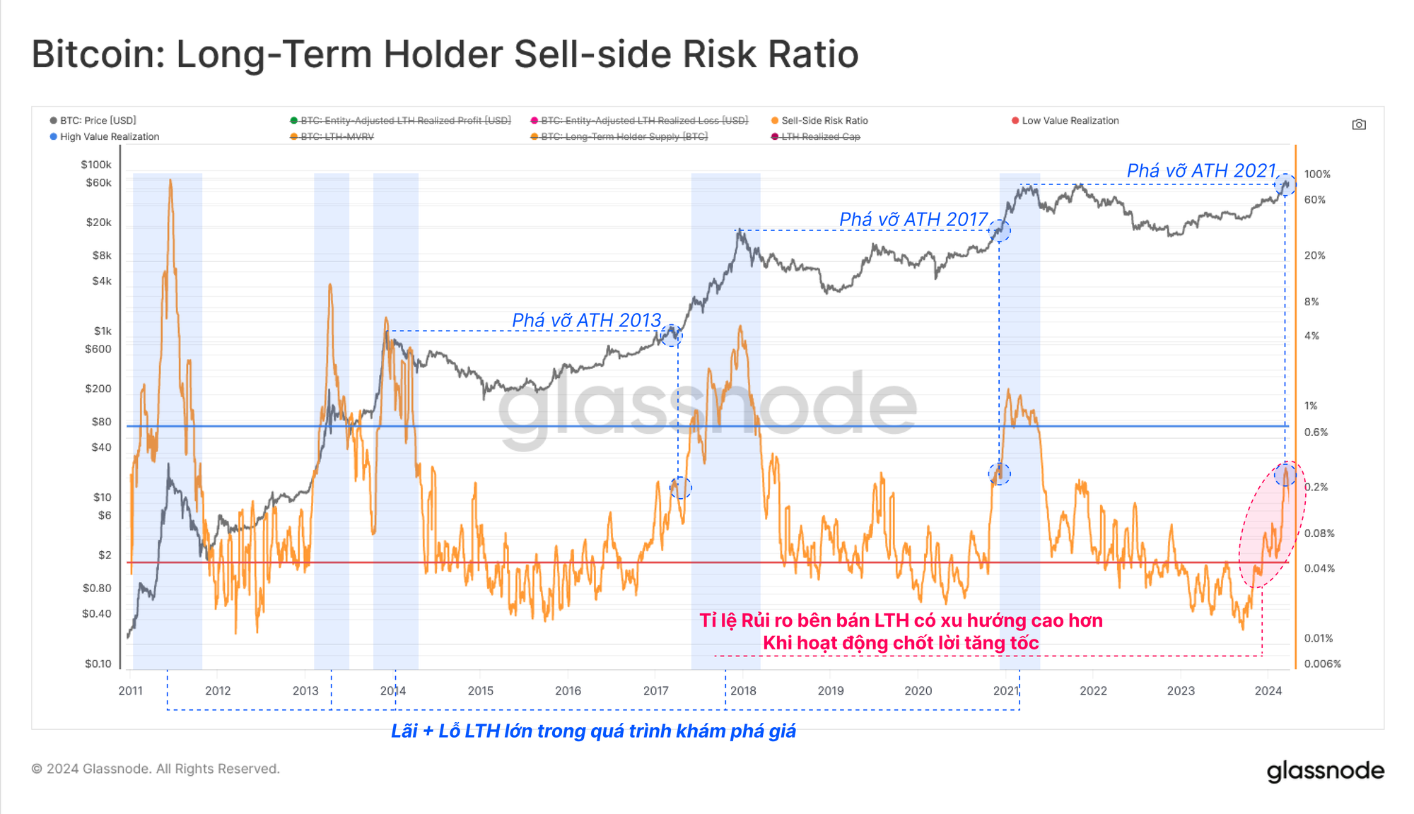 Khi Lợi nhuận thực tế của LTH tăng lên, Tỷ lệ rủi ro bên bán của họ đã bắt đầu tăng, đặc biệt kể từ tháng 10 năm 2023. Chỉ số này đang tăng rất giống với các lần phá vỡ ATH trong lịch sử cho thấy rằng áp lực phân phối và hoạt động chốt lời của nhóm LTH tương tự như các chu kỳ trước trên cơ sở tương đối.
