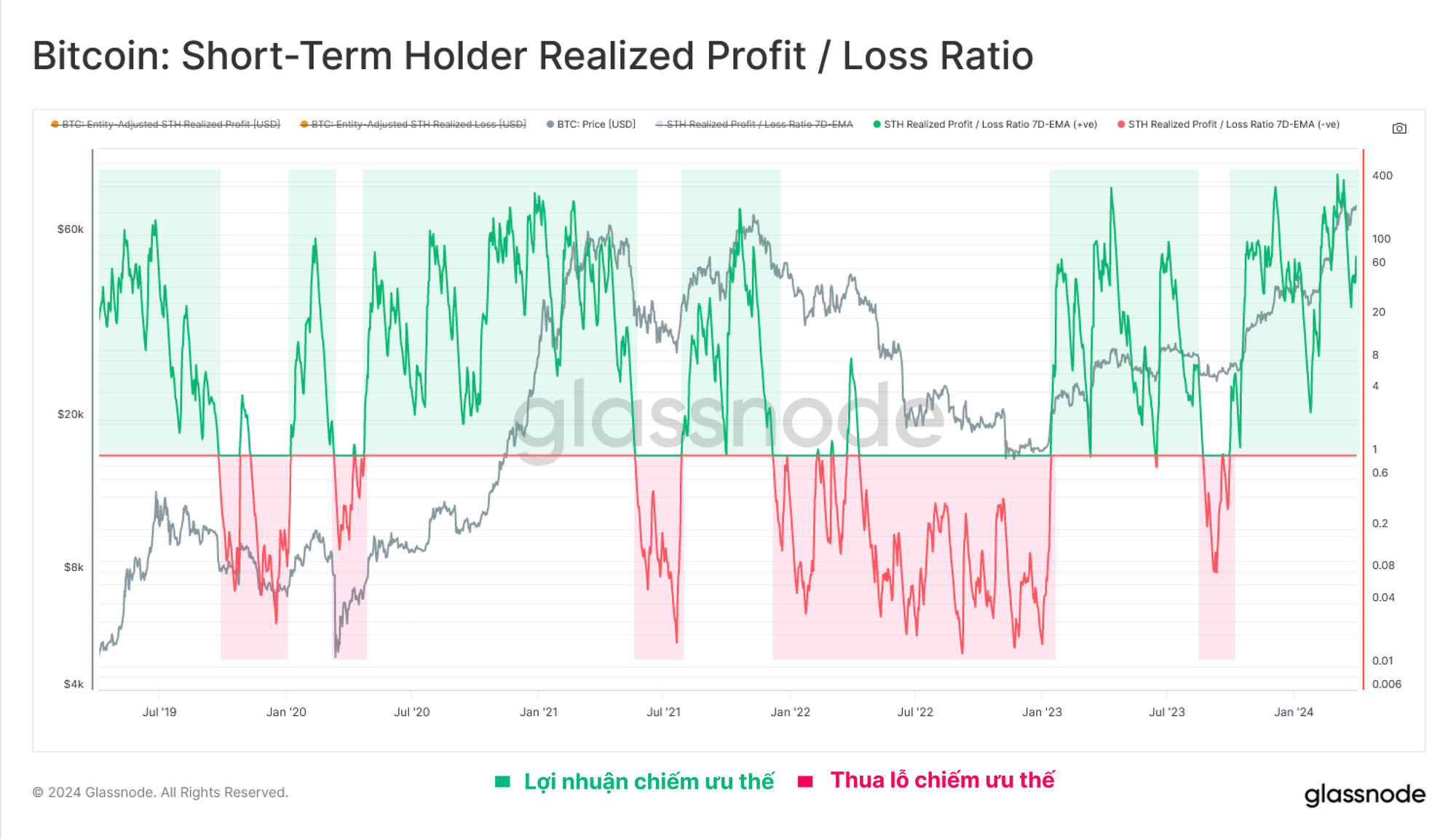 Tiếp theo, chúng tôi sẽ đánh giá chỉ số Tỷ lệ rủi ro bên bán (Sell-Side Risk Ratio) của STH để đánh giá quy mô tương đối các sự kiện chốt lời hoặc thua lỗ của họ.