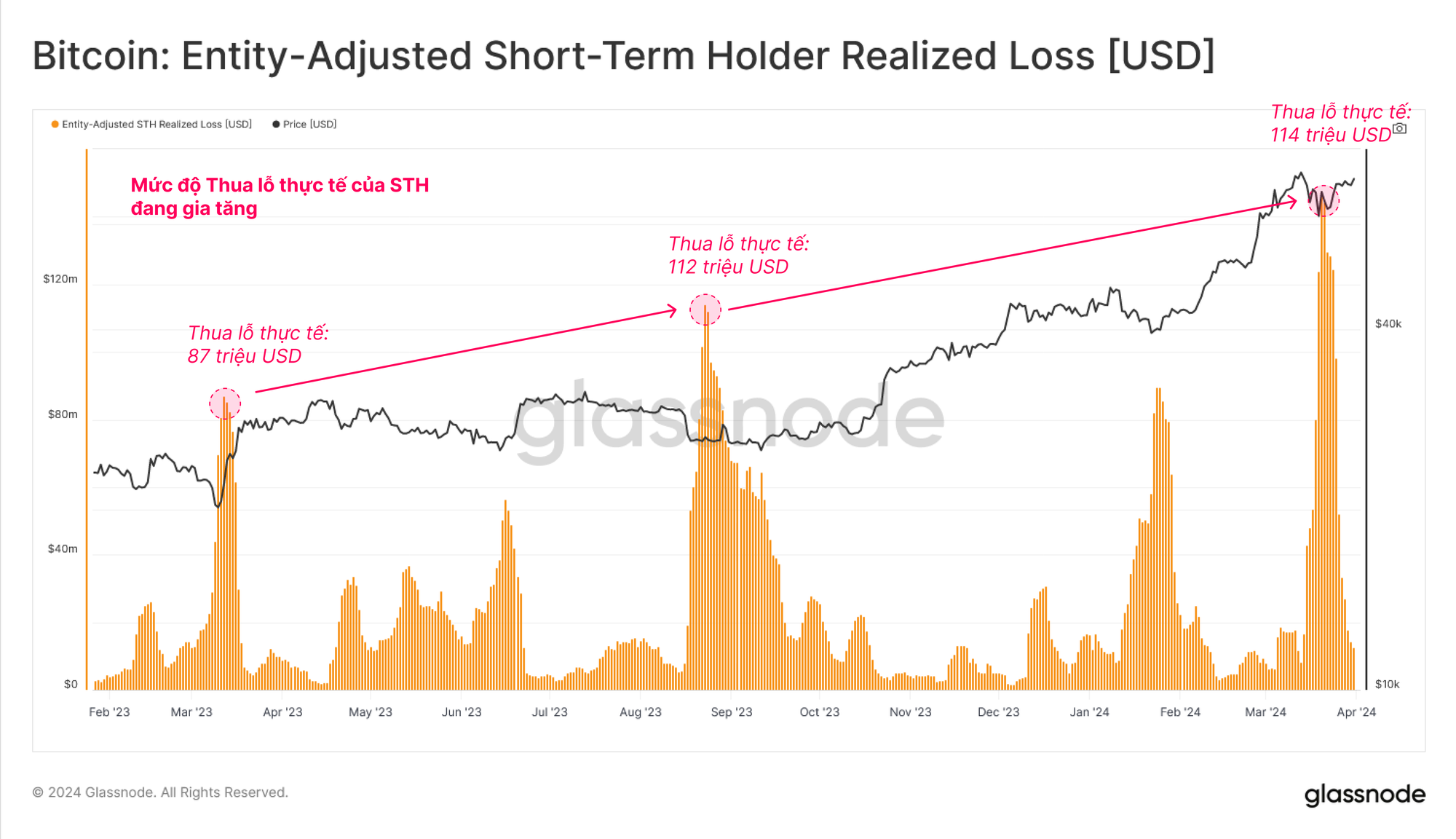 Chúng ta cũng có thể thấy rằng khoản lỗ thực tế của STH tăng đột biến trong các đợt giá giảm do những người mua tại đỉnh cục bộ chi tiêu trong hoảng loạn vì dự đoán rằng thị trường có thể giảm thêm. Mức độ thua lỗ thực tế cũng tăng lên sau mỗi lần điều chỉnh liên tiếp, điều này cho thấy sự tăng trưởng về số lượng và quy mô của những người mua tại đỉnh cao hơn ở mỗi giai đoạn.
