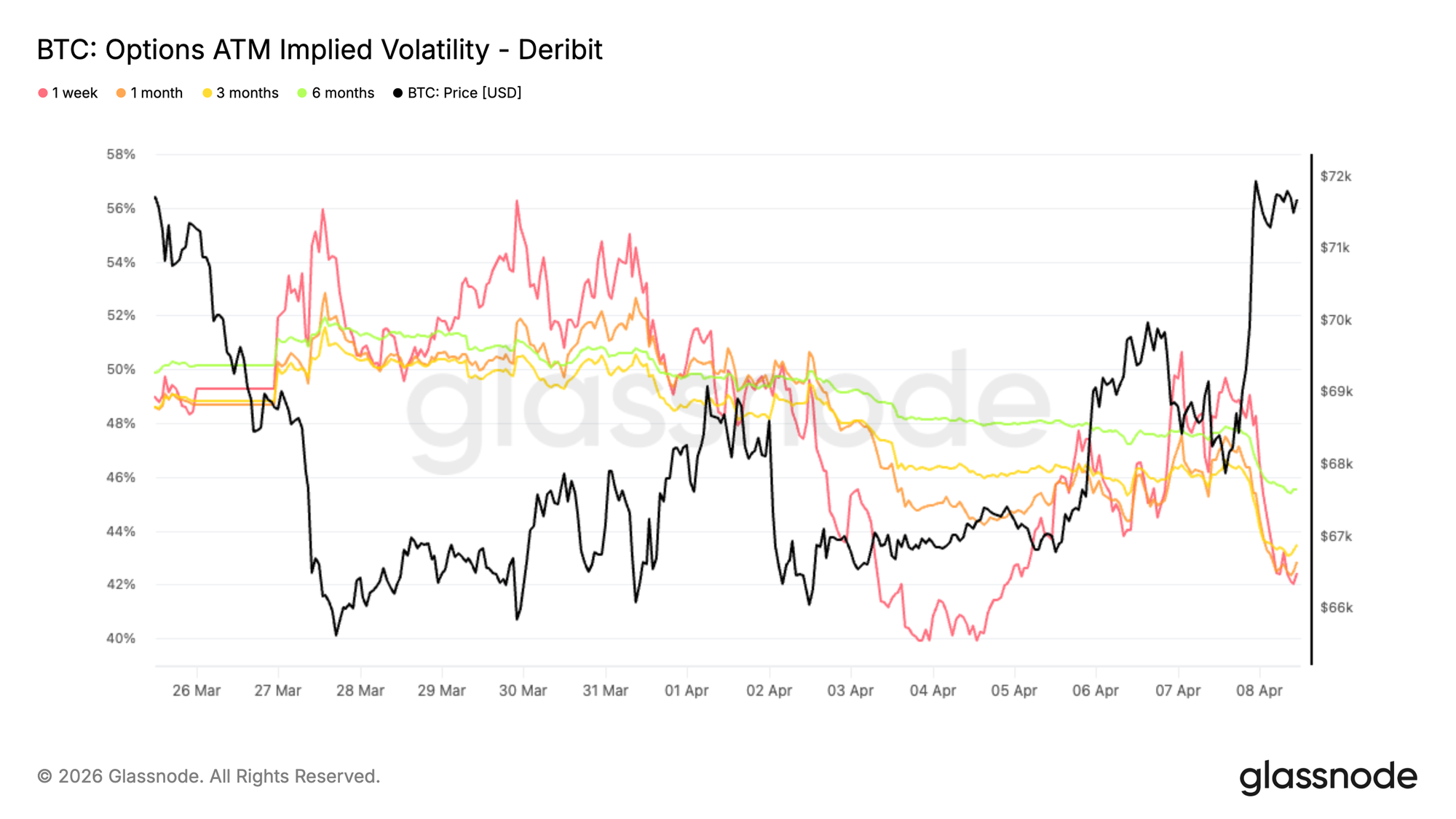Thông tin về lệnh ngừng bắn trong xung đột Iran càng làm giảm thêm biến động, đẩy nhanh quá trình nén vol. Điều này cho thấy thị trường đang định giá một môi trường ngắn hạn yên tĩnh hơn, với dấu hiệu hạ nhiệt căng thẳng nhưng vẫn thiếu niềm tin, và ít người sẵn sàng trả phí cho việc phòng hộ hoặc các vị thế convex.