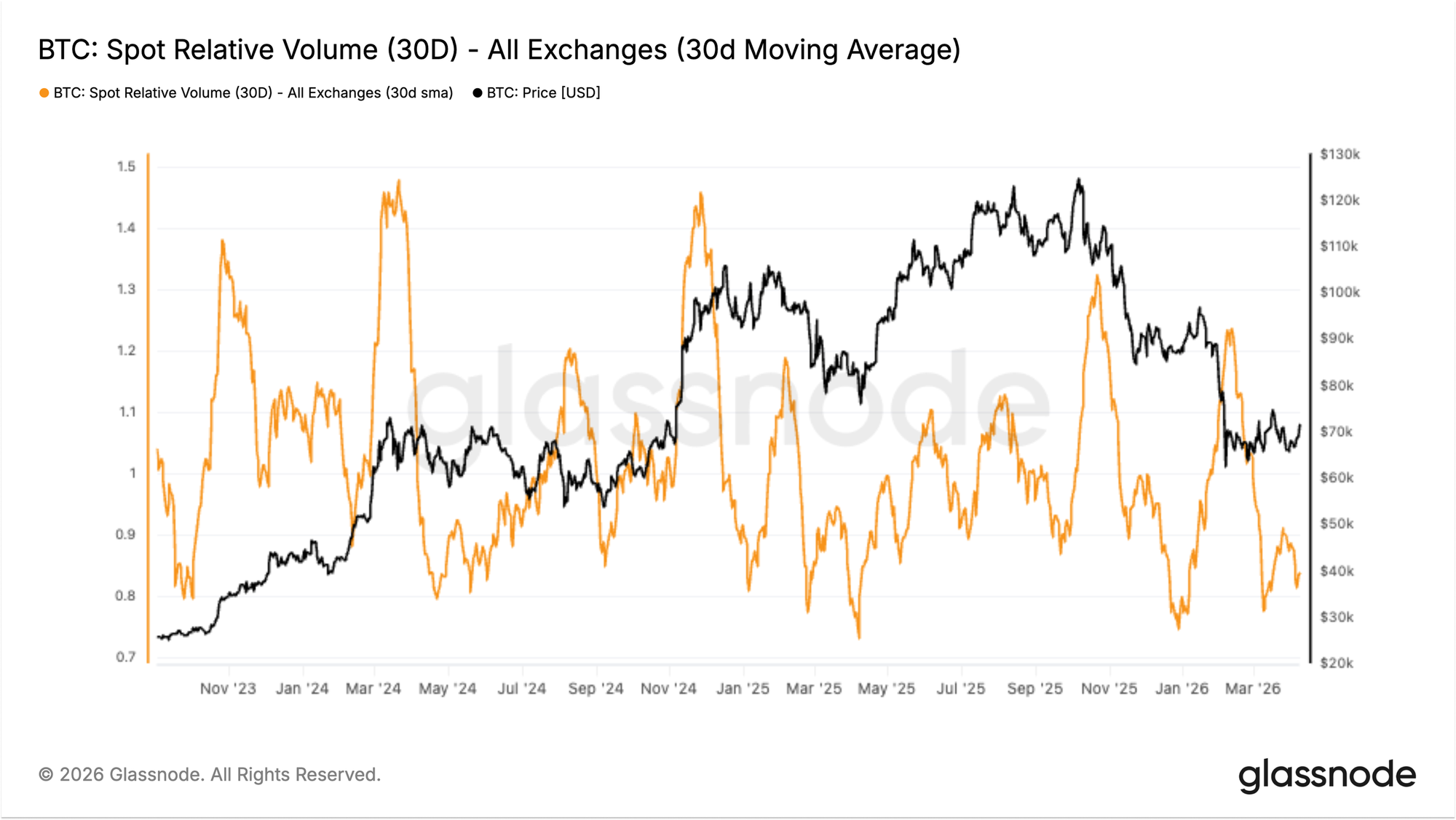 Hoạt động thị trường spot vẫn duy trì ở mức thấp, với khối lượng tương đối 30 ngày trên Binance tiếp tục nằm dưới ngưỡng 1.0 và ở vùng thấp của biên độ. Dữ liệu gần đây chỉ cho thấy một sự cải thiện nhẹ, chưa đủ để xác nhận dòng tiền quay lại một cách rõ ràng.