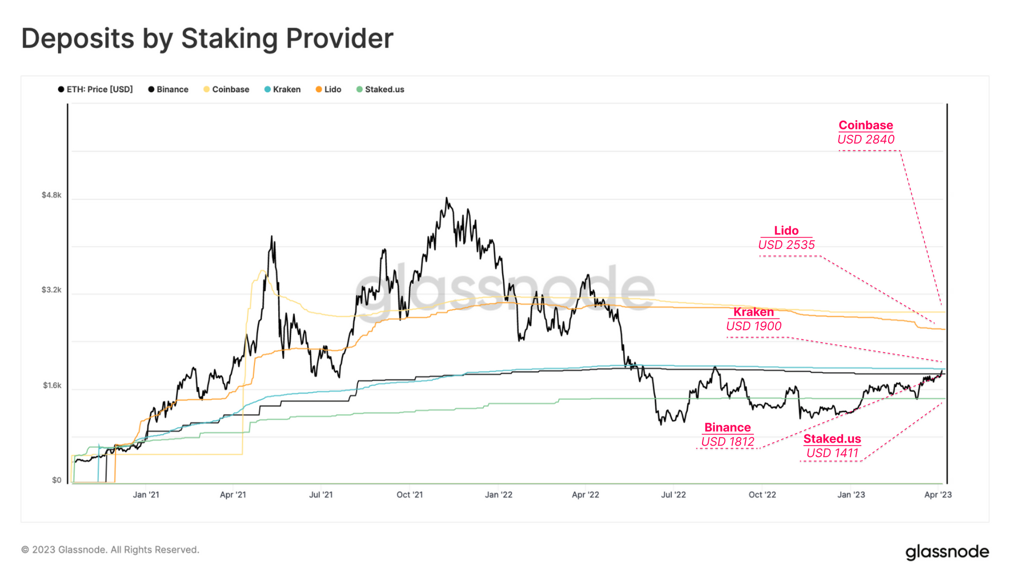 Khi kiểm tra Giá thực tế trên mỗi nhà cung cấp staking, chúng tôi nhận thấy rằng cơ sở chi phí trung bình của Coinbase và Lido cao hơn khoảng 50% so với giá giao ngay hiện tại của ETH. Binance và Kraken, hai sàn giao dịch đã chứng kiến hoạt động gửi tiền chính vào đầu đợt bull run, đang xấp xỉ mức hòa vốn theo thứ tự là $1,812 và $1,900.