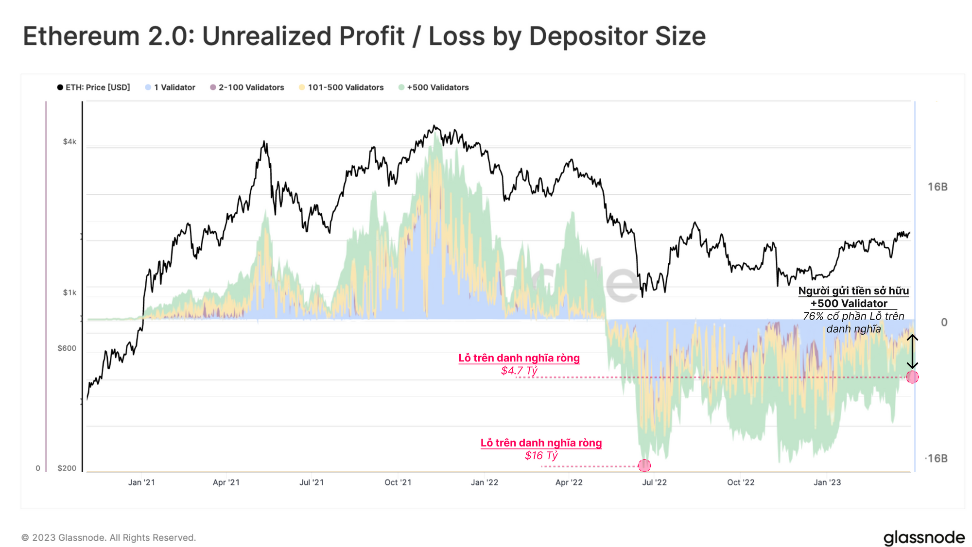 Lấy chênh lệch giữa Giá giao ngay ETH và Giá thực tế cho các khoản tiền gửi ETH, chúng tôi suy ra giá trị USD tổng hợp của lãi hoặc lỗ trên danh nghĩa của các nhà đầu tư. Kết hợp điều này với quy mô người gửi tiền, chúng tôi có thể bắt đầu thiết lập các nhóm dựa trên sự phân chia về lợi nhuận hoặc thua lỗ trên danh nghĩa giữa các nhóm người gửi tiền. Sau mức lỗ trên danh nghĩa cao nhất là $16 tỷ đô la vào tháng 7 năm 2022, khoản lỗ ròng trên danh nghĩa hiện lên tới $4.7 tỷ đô la. Chủ yếu được nắm giữ bởi những những người gửi tiền quy mô Cá voi, là những người nắm giữ 76% khoản lỗ trên danh nghĩa.