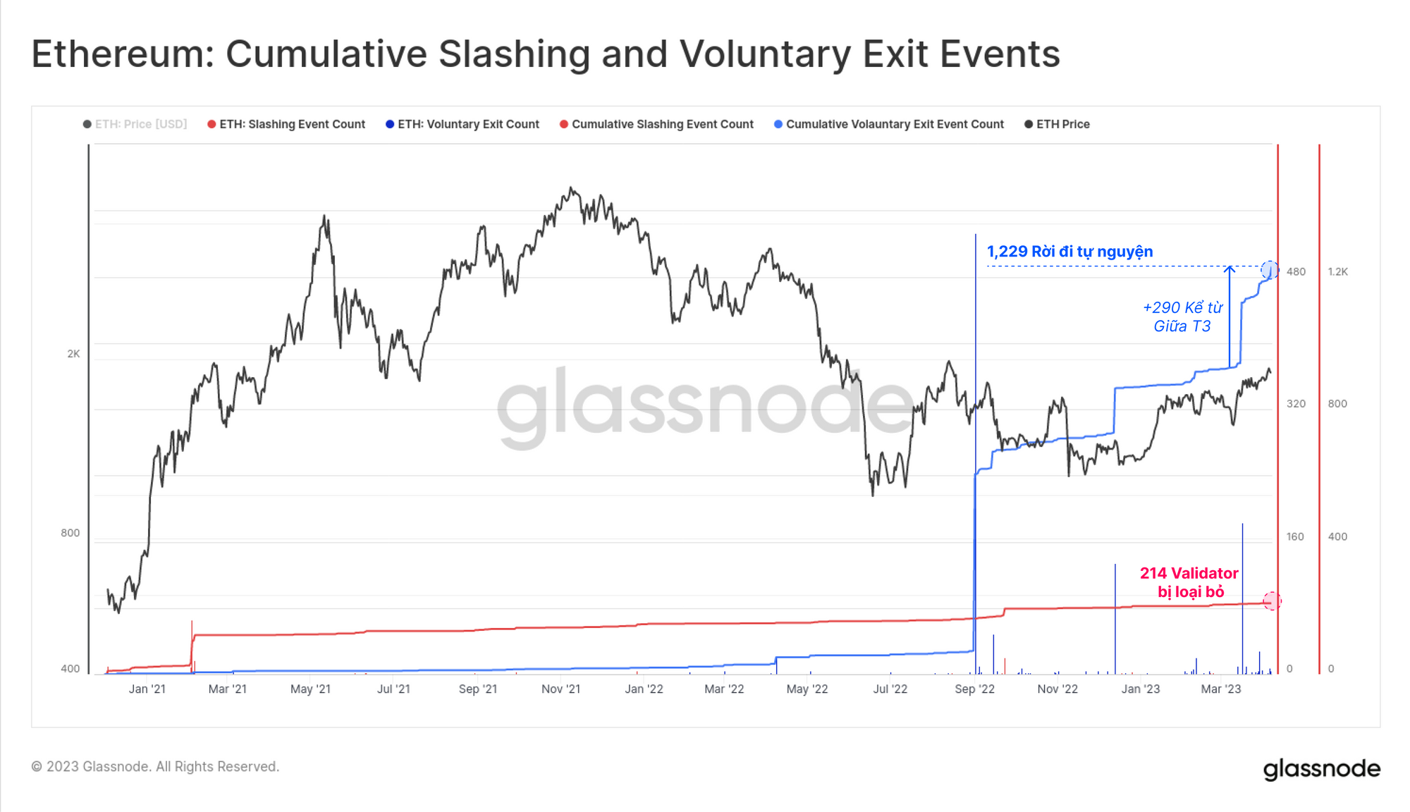 Sau ba lần tăng đáng kể về số lượng validator ký kết để rời khỏi mạng lưới tự nguyện - một lần ngay sau sự kiện The Merge vào tháng 9 năm 2022 và hai lần trong năm nay - chúng tôi hiện thấy tổng số ETH tích lũy là 45,098 (tương đương $83.3 triệu đô la) sẽ được chuyển cho các staker.
