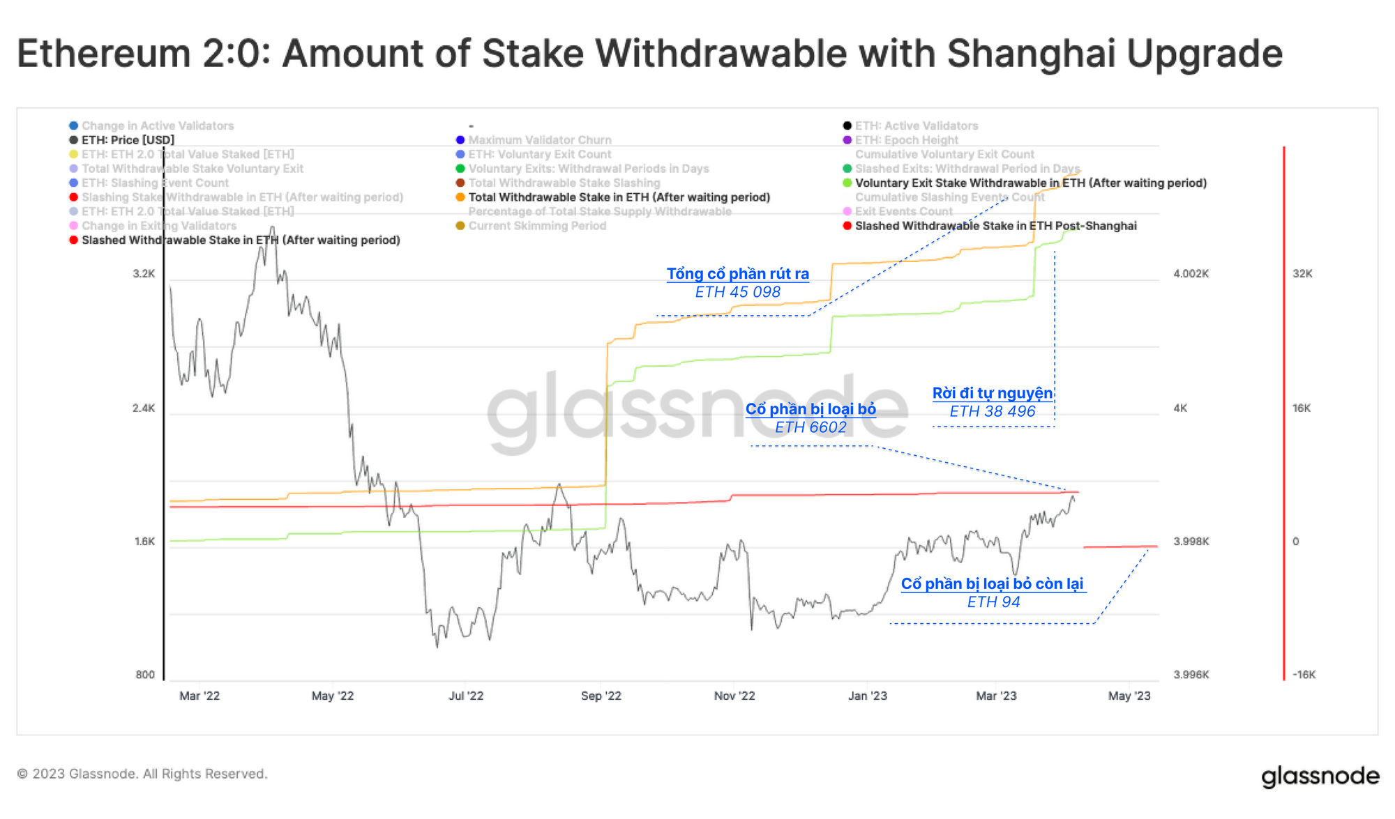 Trong khi những người gửi tiền không thể rút số ETH đã staking, họ vẫn có thể ký một thông báo thoát tự nguyện để báo hiệu mong muốn rời khỏi pool staking. Hiện có 1,229 validator đang chờ thoát, cũng như 214 validator bị cắt giảm sẽ bị loại ngay khi tính năng rút tiền được kích hoạt (với tổng số 46,176 ETH, $85.7 triệu đô la).