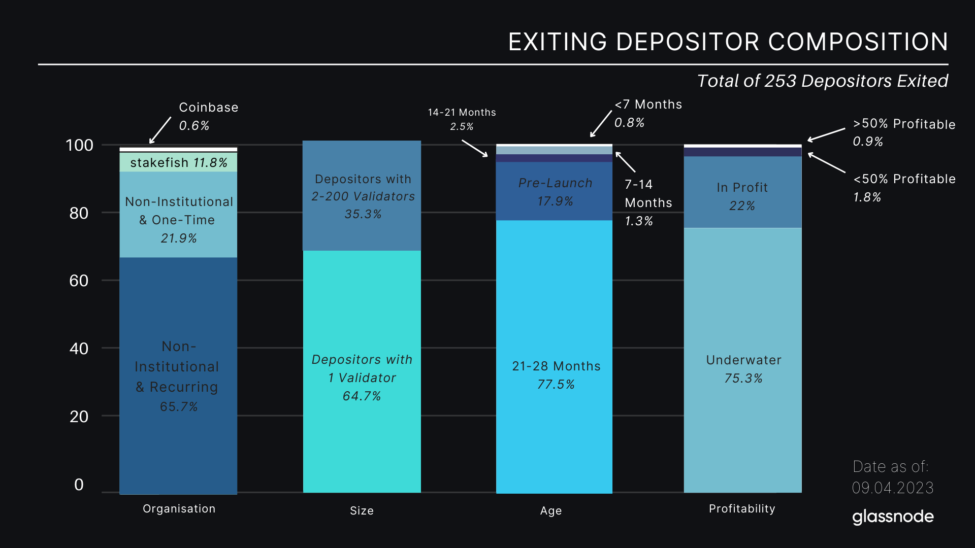 Quay trở lại phân khúc người gửi tiền, giờ đây chúng tôi có thể xác định những người có khả năng bắt đầu rút toàn bộ cổ phần của họ. Chúng tôi thấy rằng những validator rời bỏ mạng lưới thuộc về 253 người gửi tiền.