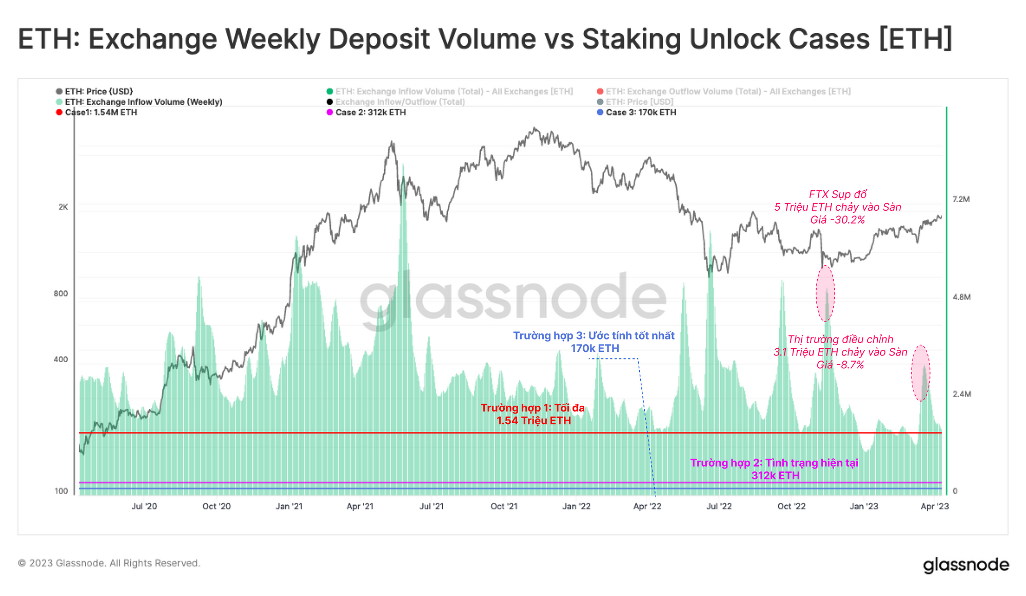 Để hiểu rõ hơn về những số liệu này, chúng ta có thể so sánh với khối lượng ETH đi vào các sàn giao dịch hàng tuần điển hình, với các sự kiện ví dụ như sự sụp đổ của FTX để đánh giá quy mô tiềm năng. Ở đây, chúng ta có thể thấy rằng ngay cả trong trường hợp cực đoan nhất là 1.53 triệu ETH thì vẫn nằm trong phạm vi dòng tiền vào sàn giao dịch trung bình hàng tuần. Nói cách khác, trong trường hợp cực đoan nhất, lượng ETH chảy vào sàn giao dịch trung bình hàng tuần sẽ tăng gấp đôi, bằng với quy mô của đợt điều chỉnh thị trường diễn ra gần đây khi giá giảm 8.7% nhưng vẫn thấp hơn nhiều so với quy mô của dòng tiền vào trong thời kỳ FTX sụp đổ với giá giảm tương ứng là 30.2%.