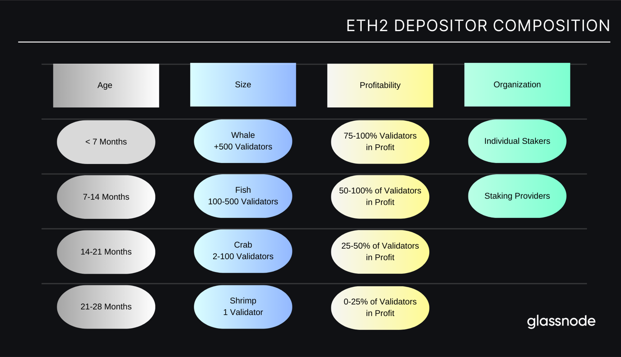 Với các phân tích của mình, chúng tôi tin rằng sẽ hợp lý hơn nếu tập trung vào depositor, vì người gửi tiền có thể sở hữu nhiều validator và cuối cùng họ chính là người sẽ đưa ra quyết định về việc rút tiền và sử dụng tiền. Để hiểu được các khả năng của bản cập nhật Shanghai/Capella, chúng tôi sẽ phân chia các depositor thành các nhóm khác nhau dựa trên nhu cầu và động cơ dự kiến để staking hoặc unstaking. Đồ họa sau đây minh họa các phân khúc mà chúng tôi đã chọn, phần lớn xem xét bốn yếu tố: