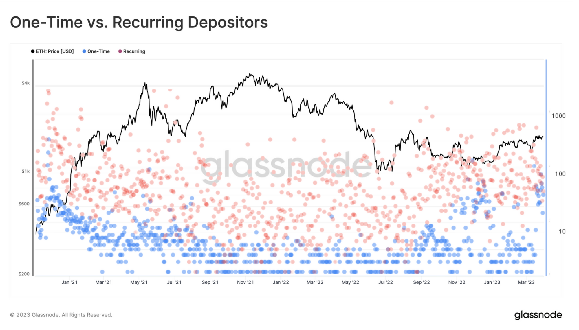 Quan sát lượng tiền gửi mỗi ngày, chúng tôi có thể phân chia giữa những người gửi tiền một lần 🔵 và các địa chỉ ví đã gửi nhiều lần 🔴.
