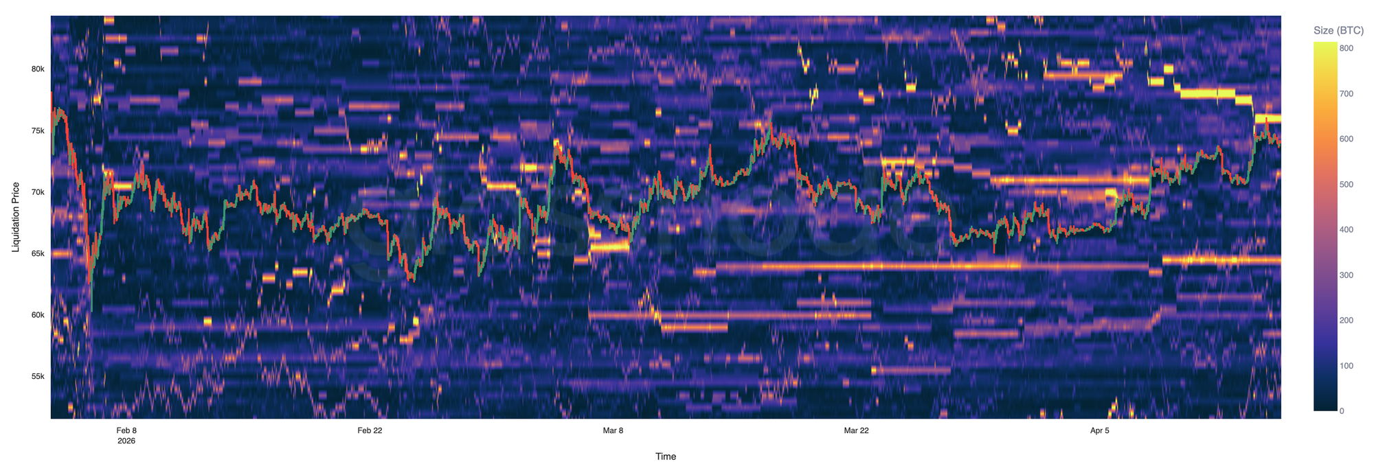 Ở phía tăng, các cụm thanh lý short tập trung quanh vùng 74.000 – 76.000 USD. Những nhịp tăng gần đây đã kiểm định khu vực này nhưng chưa thể bứt phá dứt khoát, cho thấy lượng thanh khoản phía trên vẫn đang đóng vai trò như trần cản giá.