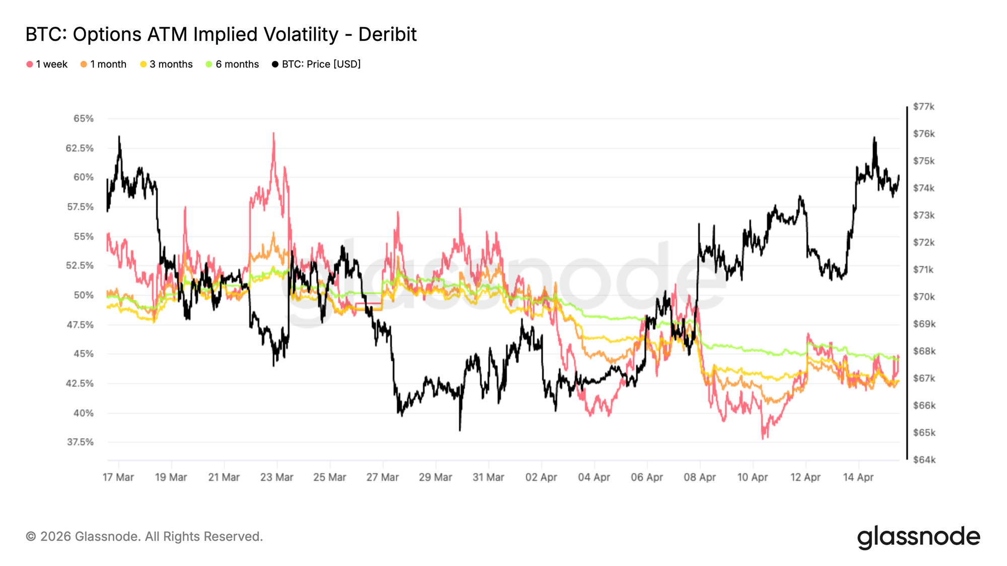 Đợt phục hồi của thị trường giao ngay chưa kéo theo sự định giá lại đáng kể về biến động, khi biến động hàm ý suy giảm trên toàn bộ đường cong kỳ hạn. Các hợp đồng ngắn hạn đã hạ nhiệt, trong khi các kỳ hạn dài hơn cũng được điều chỉnh xuống, cho thấy kỳ vọng biến động đang được bình thường hóa trên diện rộng. Cấu trúc kỳ hạn hiện vẫn tương đối phẳng, với biến động kỳ hạn 1 tháng giao dịch thấp hơn nhẹ so với 3 tháng, quanh mức 42,6%, phản ánh việc thị trường không quá cấp bách trong việc định giá rủi ro ngắn hạn. Sự nén này cho thấy các tiêu đề địa chính trị gần đây không còn được xem là chất xúc tác gây biến động kéo dài. Thay vào đó, biến động đang được định giá lại theo hướng ổn định hơn, dù các bất định vĩ mô vẫn chưa được giải quyết. Việc toàn bộ các kỳ hạn đồng loạt giảm xuống cho thấy các trader đang đóng bớt các vị thế phòng hộ, thay vì mở thêm vị thế mới.