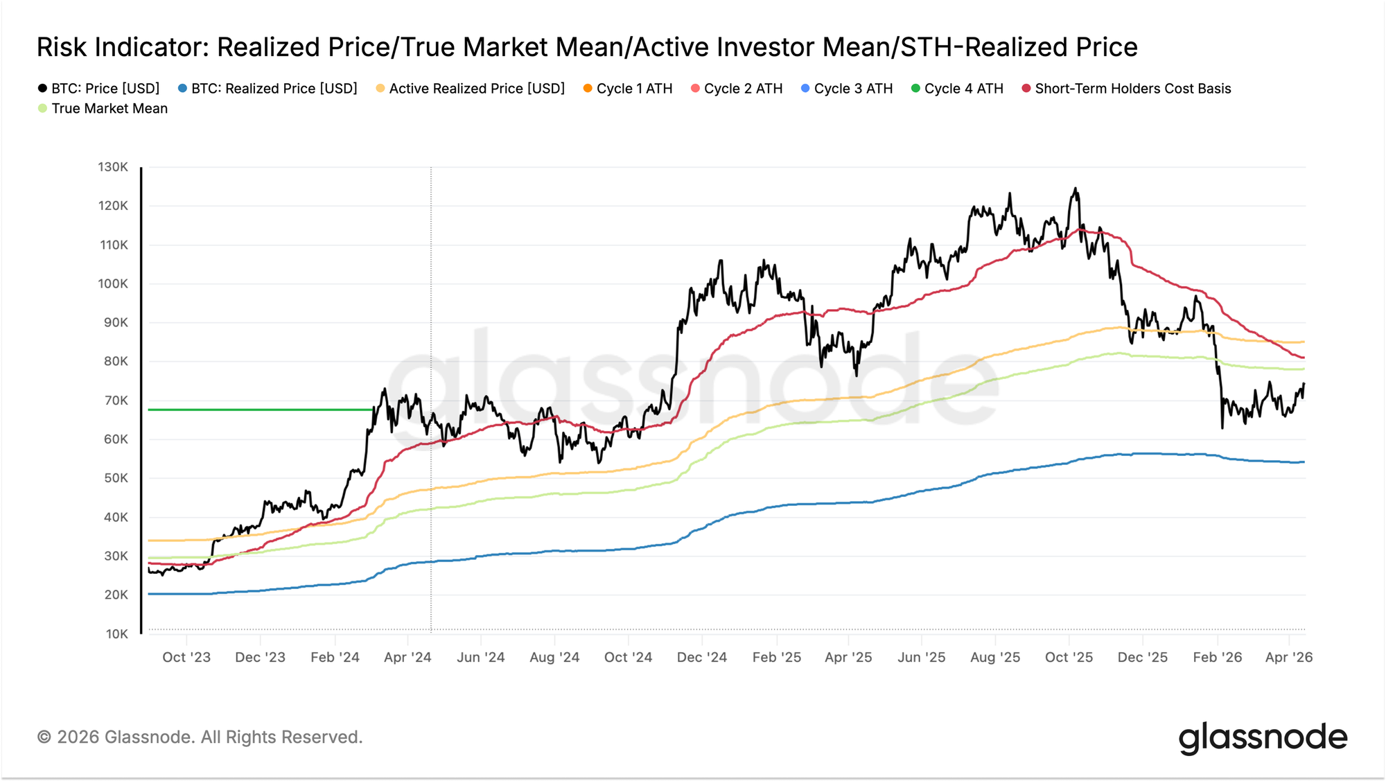 - Bitcoin has expanded to ~$74K, now 5.2% below the True Market Mean at $78.1K, which remains the key near-term resistance. Short-Term Holder Supply in Profit sits at 43.2%, leaving room for further upside before typical distribution thresholds are reached.