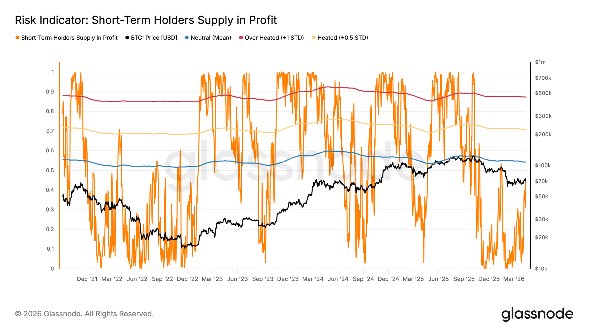 Chỉ số Phần trăm nguồn cung của nhà đầu tư ngắn hạn đang có lãi đo lường tỷ lệ nguồn cung được mua gần đây hiện đang nằm trong trạng thái lợi nhuận chưa thực hiện, đóng vai trò như một thước đo trực tiếp cho áp lực chốt lời từ các nhà đầu tư mới tham gia thị trường. Trong lịch sử, các đỉnh cục bộ trong những nhịp hồi của thị trường gấu thường hình thành khi chỉ số này tiến gần mức trung bình thống kê khoảng 54,2% — ngưỡng mà tại đó số lượng nhà đầu tư ngắn hạn có lãi đủ lớn để kích hoạt hoạt động phân phối đáng kể.