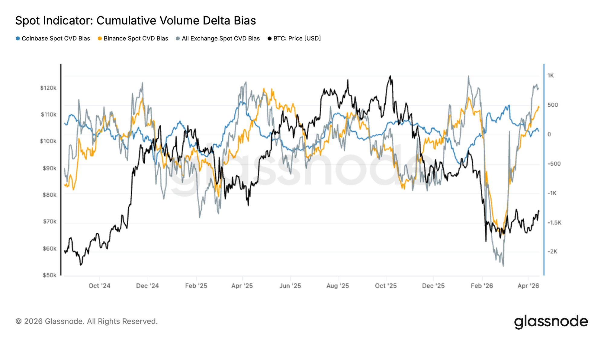 Dòng tiền trên Binance đang dẫn dắt đà tăng, cho thấy hoạt động quay trở lại từ nhóm nhà đầu tư ngoài Mỹ và phân khúc bán lẻ. Ngược lại, CVD trên Coinbase vẫn tương đối yếu, phản ánh sự tham gia trở lại chậm hơn từ các tổ chức. Sự phân kỳ này là điểm đáng chú ý, bởi các xu hướng tăng bền vững thường đòi hỏi sự tham gia rộng rãi từ cả hai nhóm.