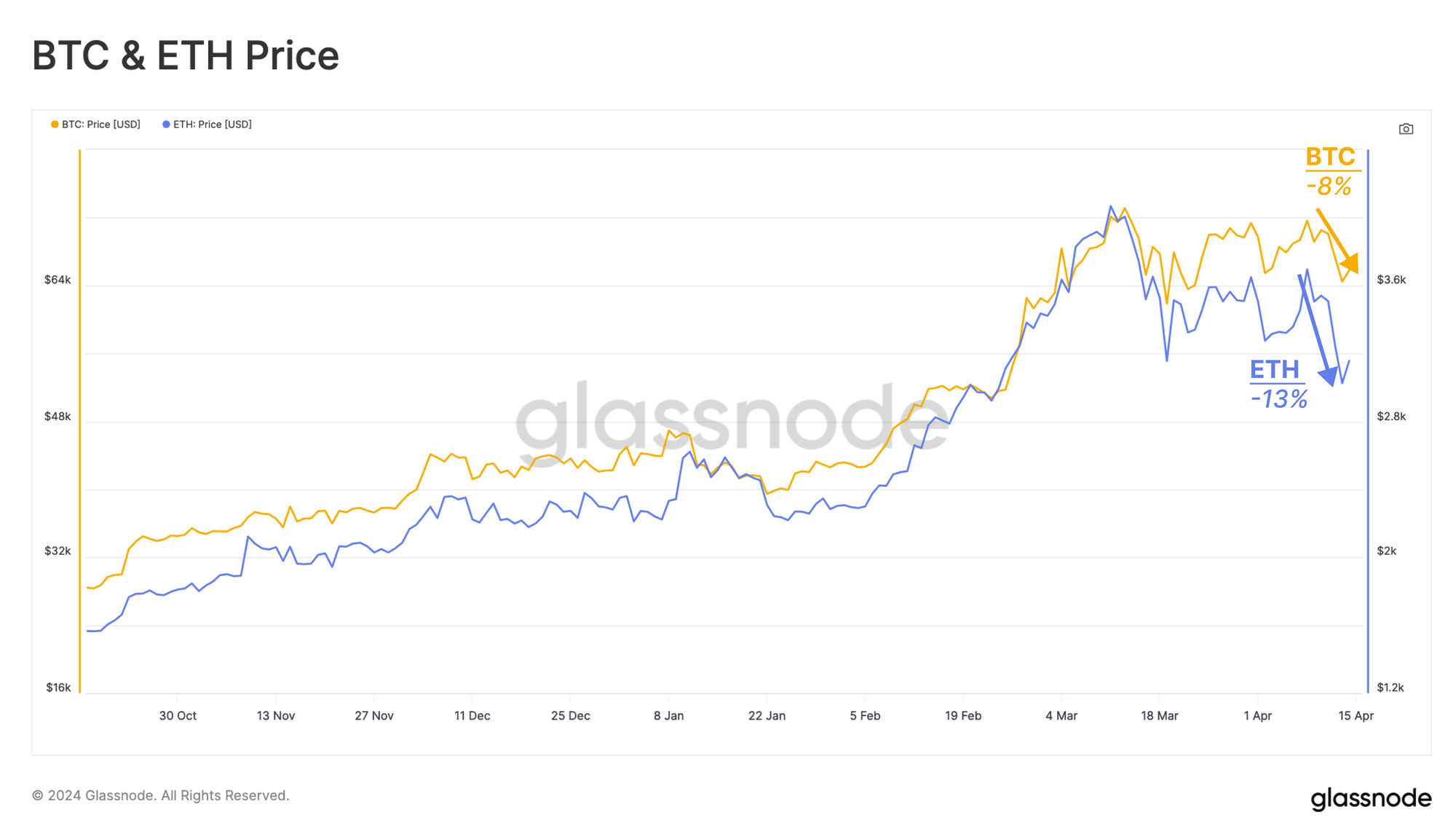 Chúng ta đã chứng kiến sự gia tăng căng thẳng địa chính trị ở Trung Đông, đỉnh điểm là các cuộc tấn công bằng máy bay không người lái vào Israel vào thứ Bảy tuần trước. Do thị trường tiền mã hoá là tài sản duy nhất giao dịch vào cuối tuần, điều này đã gây ra sự suy giảm đáng chú ý trên thị trường tài sản kỹ thuật số. BTC giảm -8%, trong khi ETH giảm -13%. Thị trường phục hồi nhẹ nhưng vẫn tiếp tục giao dịch đi ngang và giảm do sự thận trọng từ các nhà đầu tư về tác động dài hạn.