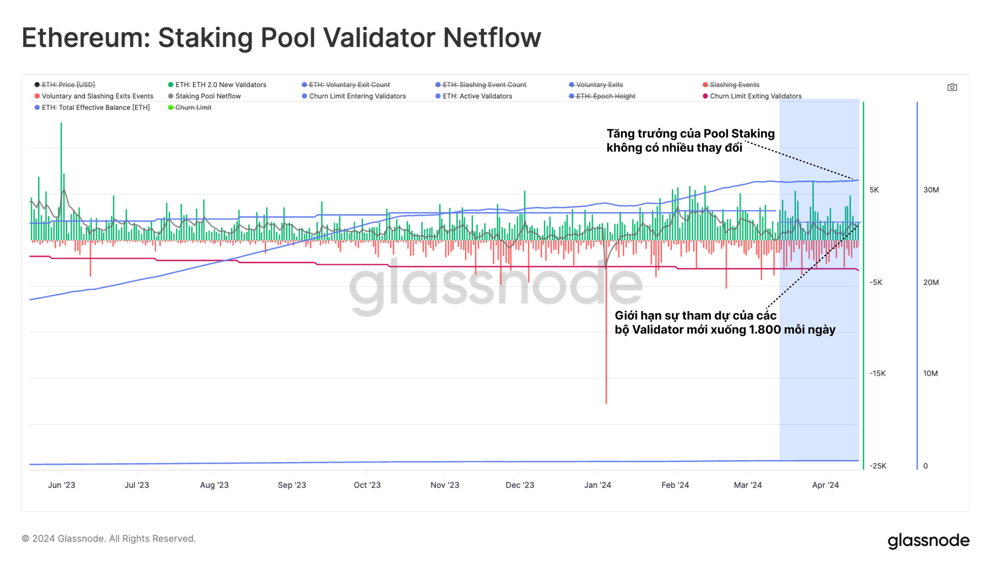 Tuy nhiên, sự tăng trưởng của pool staking đã bị hạn chế đôi chút trong lần nâng cấp Decun vừa qua. Hardfork đã giới hạn 8 validator mới cho mỗi epoch 6,4 phút và thay thế cho chức năng giới hạn rời bỏ. Điều này đã giới hạn một cách hiệu quả số lượng validator và số lượng cổ phần có thể tham gia pool staking, mang lại sự hỗ trợ nhỏ trong thời điểm hiện tại.
