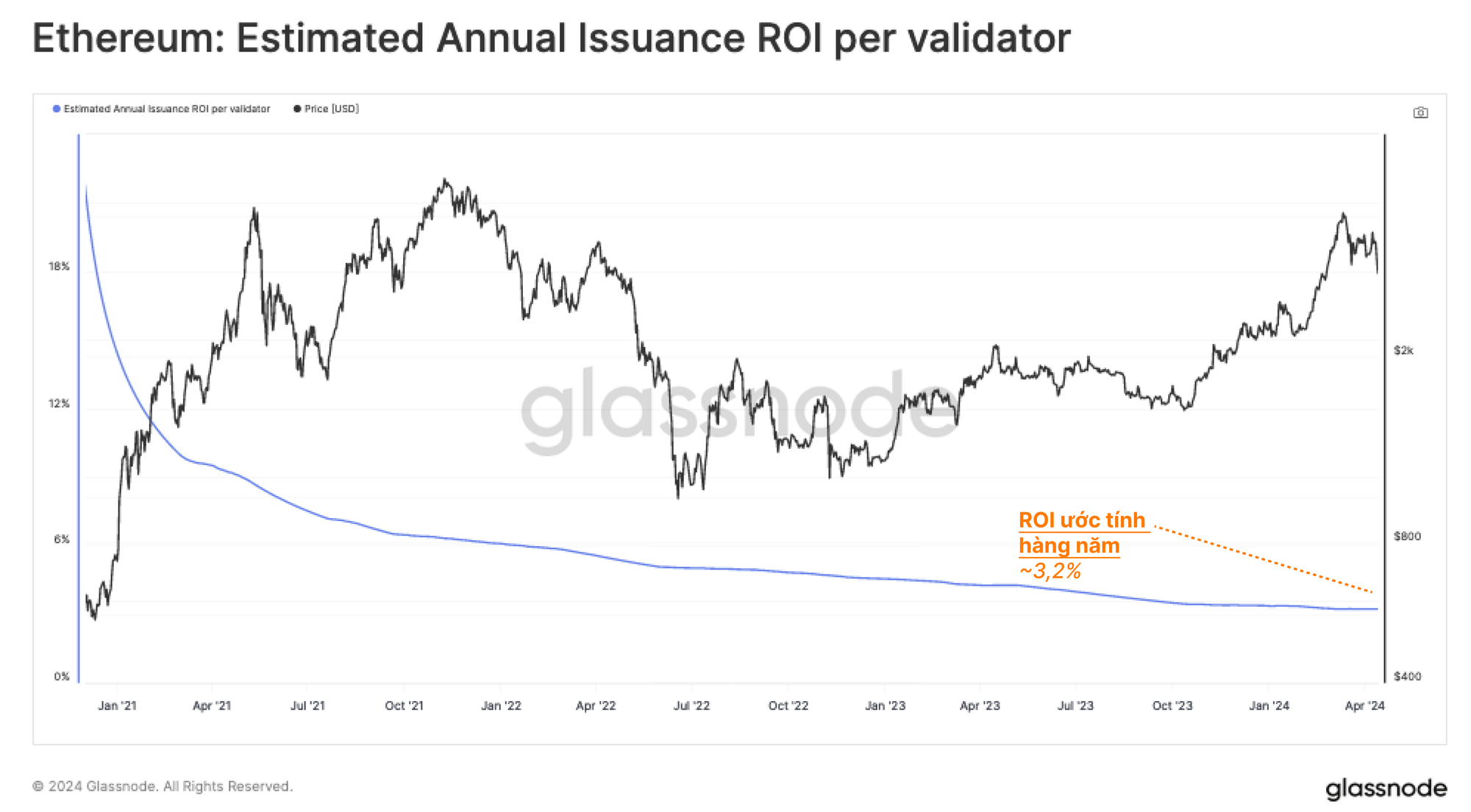 Ban đầu, giao thức Proof-of-Stake được thiết kế sao cho nhiều ETH được stake hơn thì doanh thu biên cho mỗi validator sẽ giảm. Cơ chế này tự điều chỉnh quy mô của pool staking và với 31,4 triệu ETH hiện đang được stake, APY hàng năm ước tính cho mỗi validator là khoảng 3,2%.