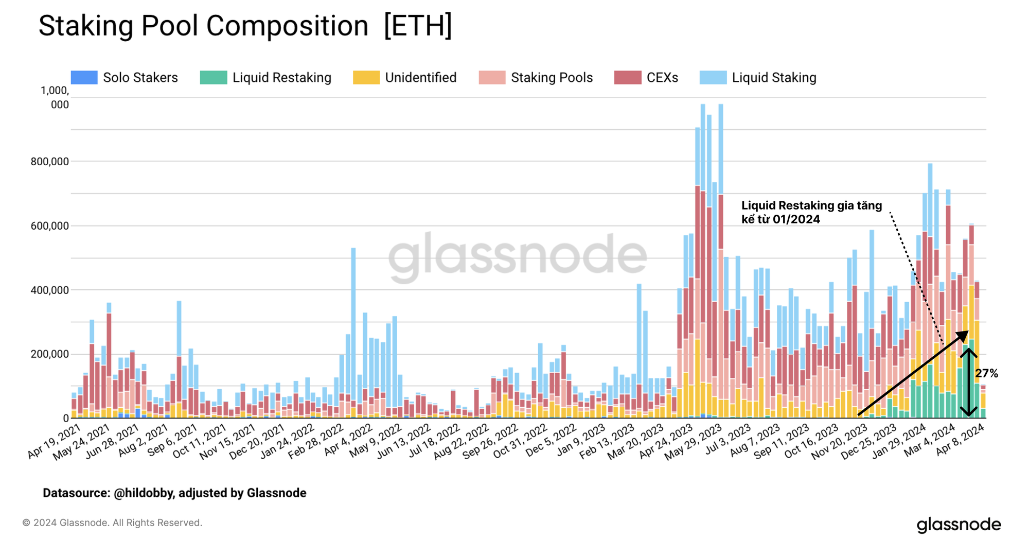 Phân loại các khoản tiền gửi staking theo nguồn gốc cho thấy sự gia tăng đáng chú ý về số lượng ETH được stake bởi các nhà cung cấp Liquid Restaking kể từ đầu năm. Các giao thức này hiện chiếm 27% số ETH mới đã được stake, trong khi số tiền gửi mới của các nhà cung cấp Liquid Staking đã giảm dần kể từ giữa tháng 3.