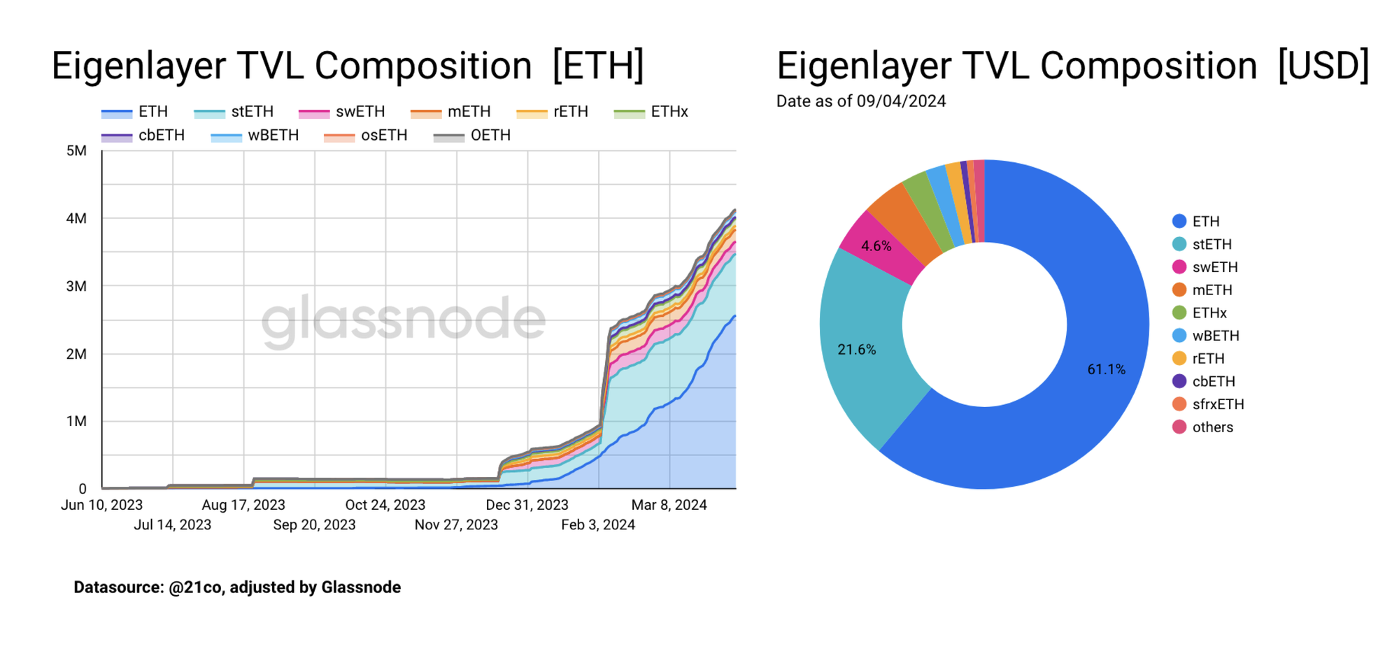 Hơn 61,1% TVL của Eigenlayer đến từ ETH đã được stake, phần còn lại được tạo thành từ các token Liquid Staking, trong đó stETH của Lido dẫn đầu với 21,5% tổng TVL.
