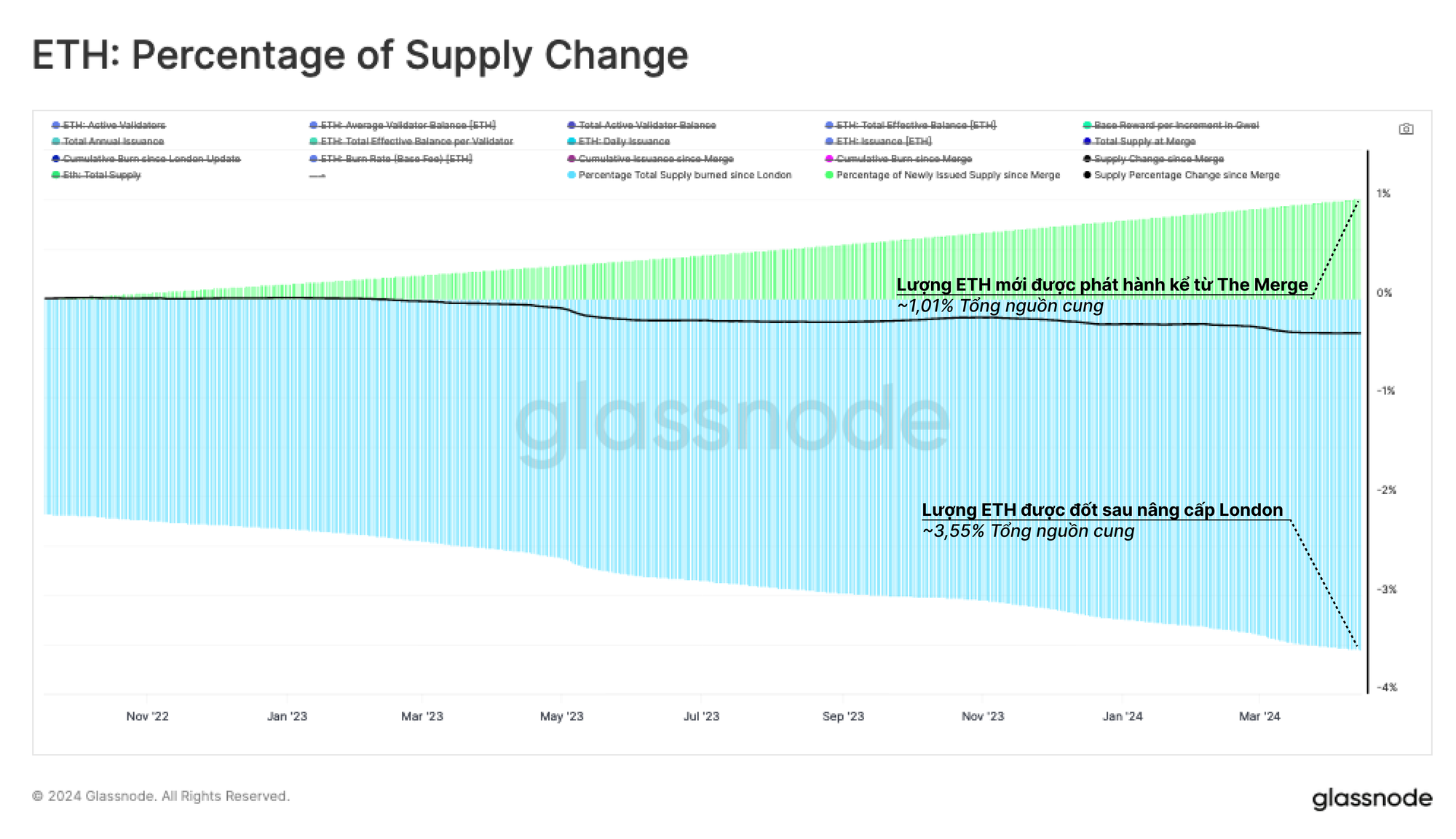 Staking trên Ethereum đã có nhu cầu cao bất ngờ, với lượng ETH tích cực tham gia vào Bằng chứng cổ phần (Proof-of-Stake) hiện ở mức 31,4 triệu ETH (~ 26% tổng nguồn cung). Chúng ta có thể thấy tốc độ tăng trưởng của các ETH được stake đang tăng lên trong những tháng gần đây. Điều này xảy ra sau khi các cải tiến mới như giao thức Eigenlayer Restaking được ra mắt vào tháng 6 năm 2023 và các giao thức Liquid Restaking ra mắt vào đầu năm 2024.