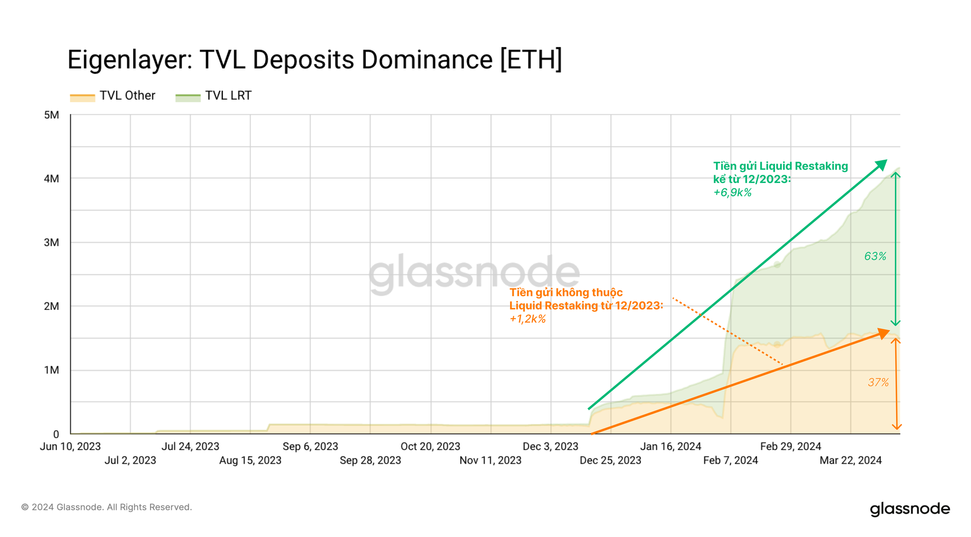 Liquid Restaking hoạt động giống như Liquid Staking, cho phép người dùng stake lại (restake) các token của họ, đổi lại người dùng sẽ nhận được đại diện thanh khoản cho tài sản đã được restake. Đây là một tùy chọn có vẻ được ưa thích bởi người dùng Eigenlayer, với 63% tiền gửi vào Eigenlayer được thực hiện thông qua các nhà cung cấp Liquid Restaking.