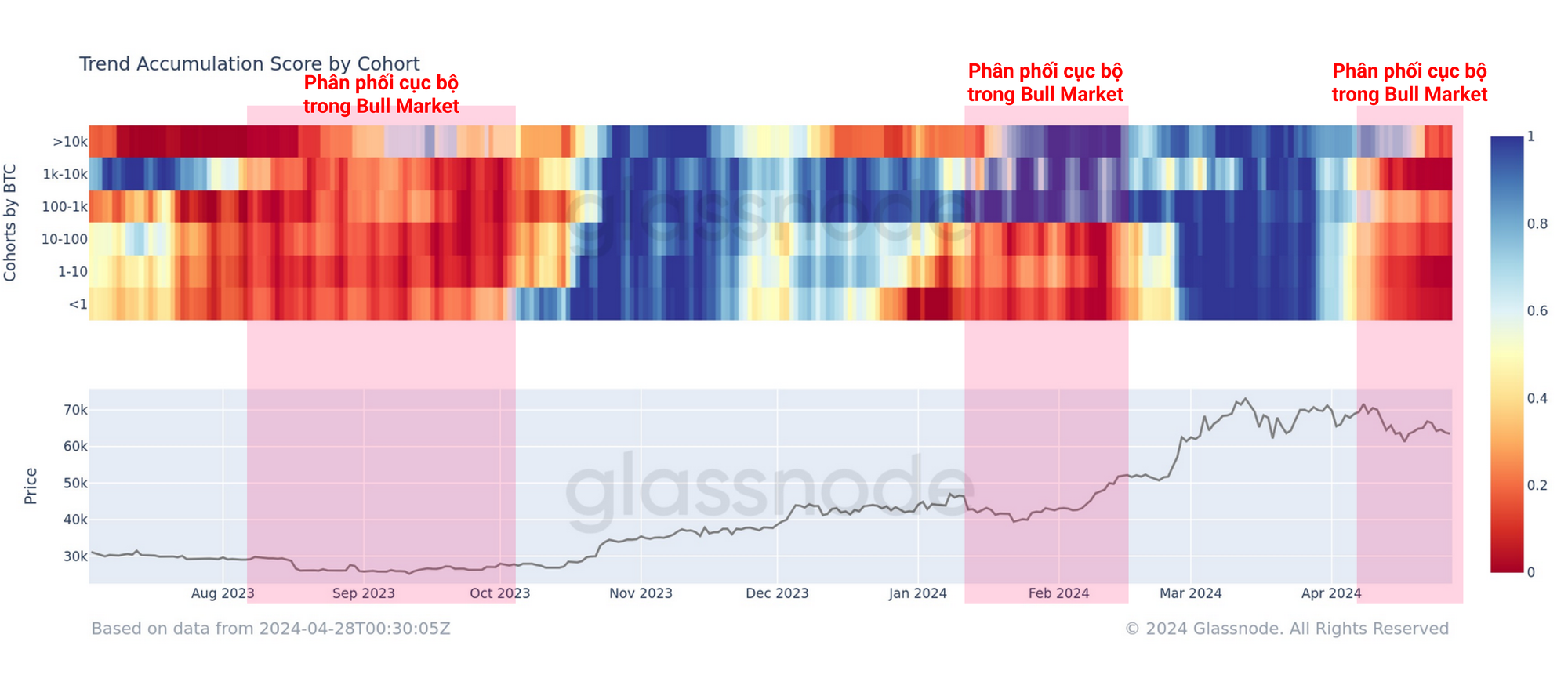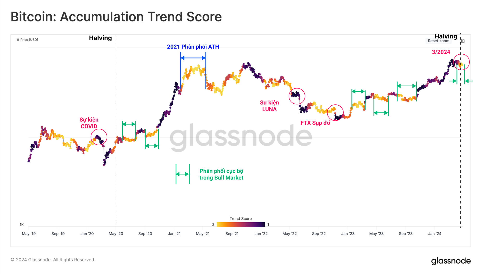 Trong các giai đoạn đầu của cả hai đợt tăng giá 2020-21 và 2023-24, chúng tôi có thể thấy sự hợp lưu giữa các chế độ phân phối cục bộ (màu sáng) và các khoảng thời gian giảm giá. Khi thị trường phục hồi lên mức cao mới, áp lực bán lại được kích hoạt vì các nhà đầu tư đưa nguồn cung không hoạt động trở lại thị trường nhằm đáp ứng nhu cầu đang chảy vào.