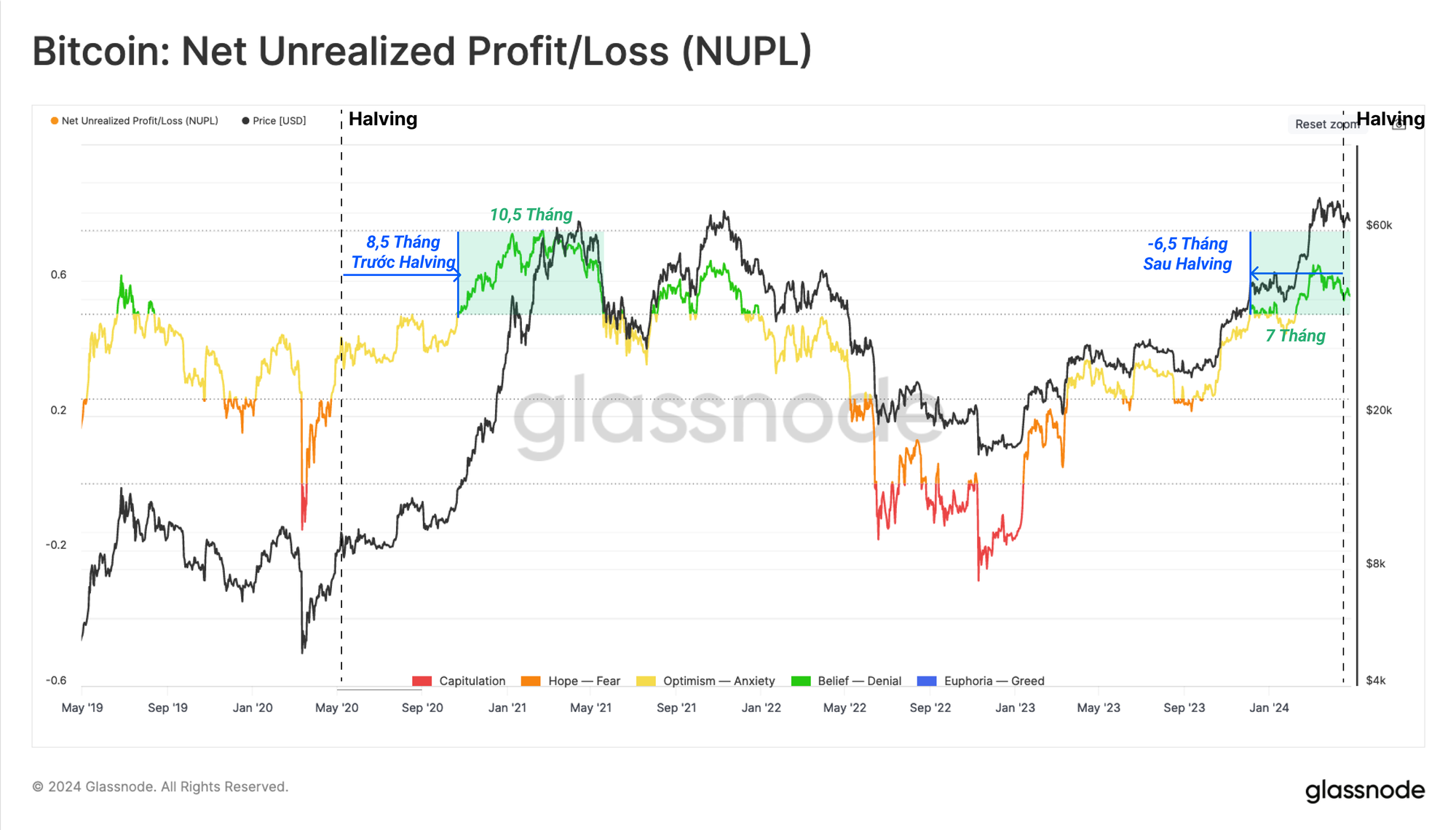 Trong chu kỳ 2020-21, giai đoạn này được kích hoạt 8,5 tháng sau Bitcoin halving và đã chứng kiến xu hướng tăng giá duy trì trong gần 10,5 tháng sau đó. Tuy nhiên, trong chu kỳ này, NUPL đã phá vỡ mức 0,5 khoảng 6,5 tháng trước halving. Sự thay đổi rõ rệt này nêu bật tầm quan trọng của các quỹ ETF Hoa Kỳ trong việc định hình và thúc đẩy hành động giá bằng cách đưa nhu cầu mạnh mẽ vào thị trường.