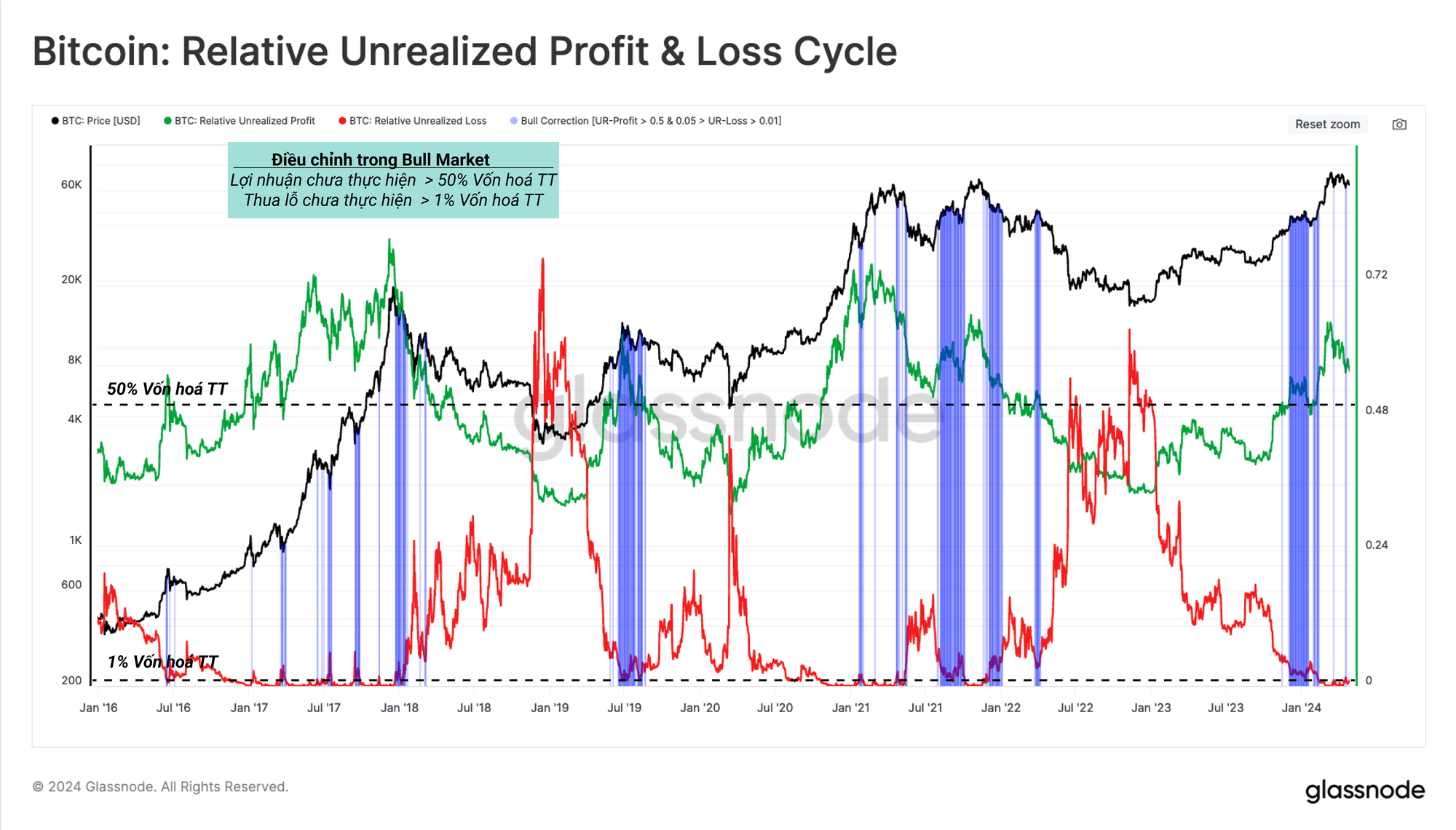 Theo số liệu này, giai đoạn Hưng phấn (NUPL>0,5) của thị trường tăng giá đã có hiệu lực trong 7 tháng qua. Tuy nhiên, ngay cả những xu hướng tăng mạnh nhất cũng phải trải qua những đợt điều chỉnh và những sự kiện này cung cấp các thông tin giá trị về vị thế cũng như tâm lý nhà đầu tư.