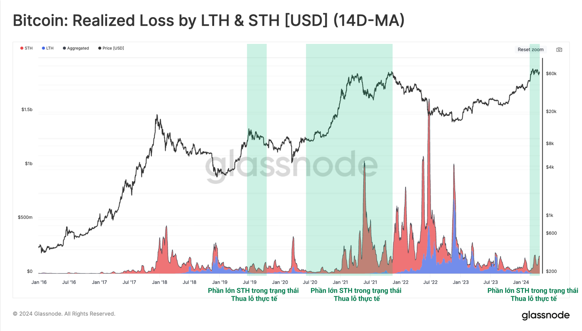 Lưu ý rằng khoản lỗ thực tế của nhóm này có xu hướng đạt đỉnh gần các đáy cục bộ do những người mua gần đây bán coin của họ trong hoảng loạn.