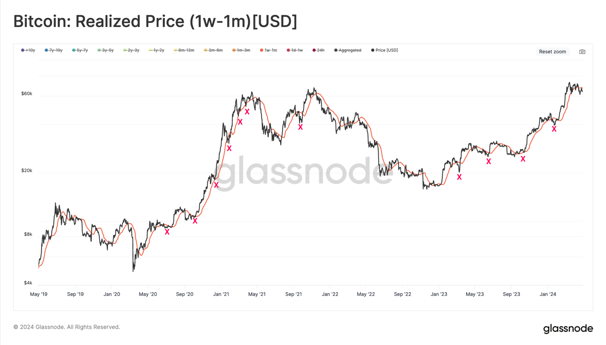 Trong số các nhóm nhà đầu tư nắm giữ Bitcoin có độ tuổi trẻ hơn này, cơ sở chi phí của các nhóm 1 tháng-3 tháng 🟠 và 3 tháng-6 tháng 🟡 nổi lên như những công cụ giá trị để phân biệt cấu trúc thị trường tăng giá và giảm giá. Tuy nhiên, cơ sở chi phí 1 tuần-1 tháng 🔴 đã thể hiện tương ứng với các bước ngoặt của thị trường, giúp chúng tôi phát hiện các đáy cục bộ tiềm năng (trong thị trường tăng giá) và đỉnh cục bộ tiềm năng (trong thị trường giảm giá).