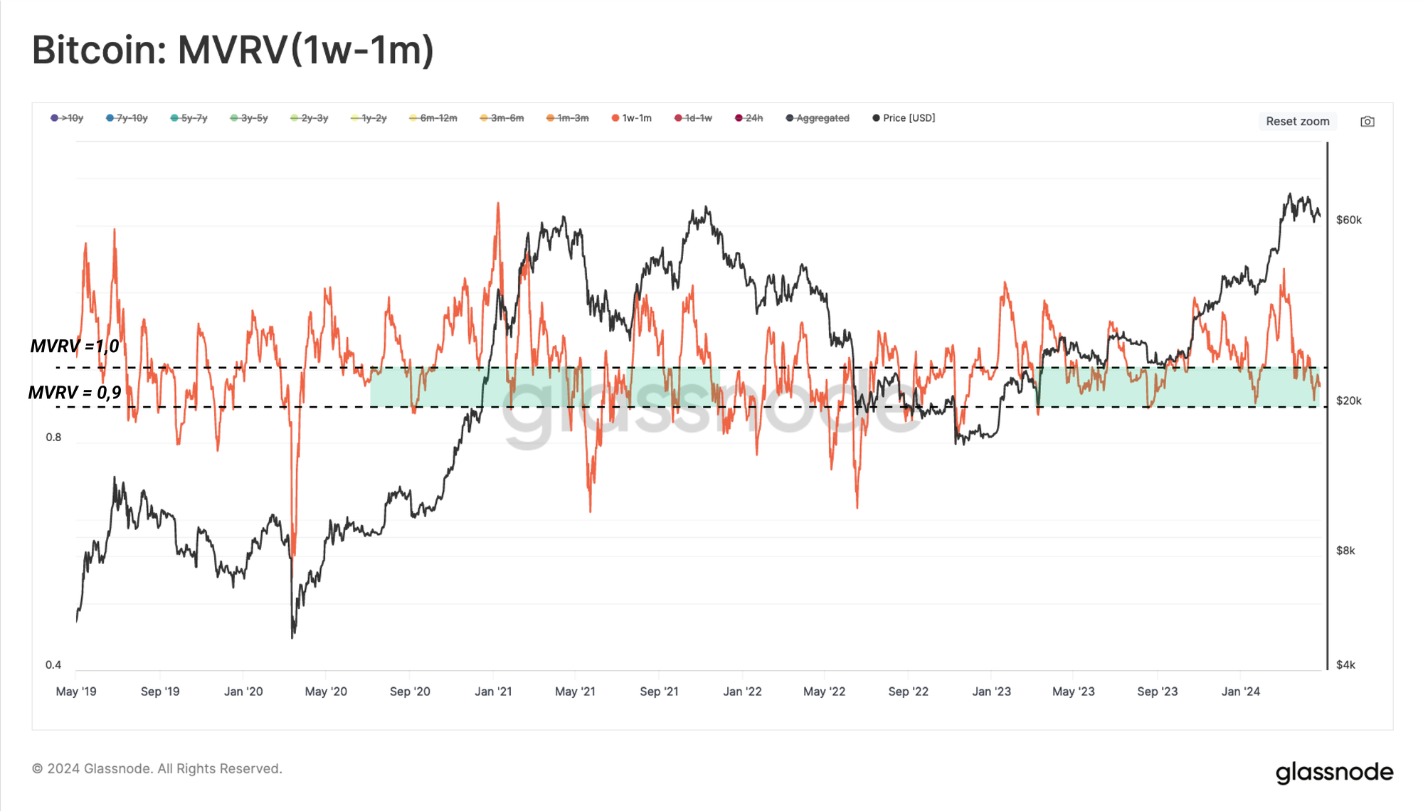 Biểu đồ sau đây cho thấy tỷ lệ MVRV (1 tuần-1 tháng) thường giảm xuống phạm vi 0,9-1 trong các đợt sụt giảm của thị trường tăng giá. Điều này có nghĩa là thị trường thường giảm từ 0% đến -10% dưới cơ sở chi phí trung bình của các nhà đầu tư 1 tuần-1 tháng.