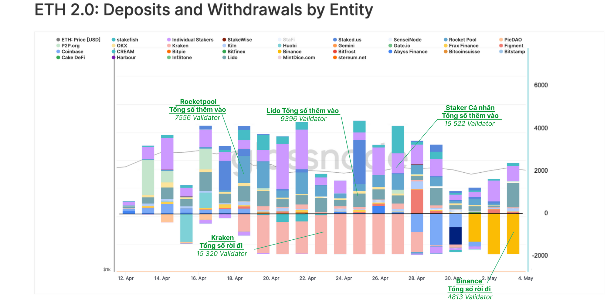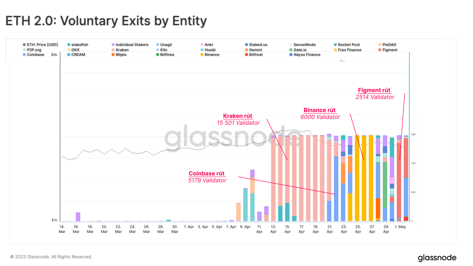 Chỉ riêng Kraken đã rút 15,501 validator, chiếm 496,000 trong tổng số 1.55 triệu ETH (32%). Binance theo sau với 6,000 validator đã ngừng hoạt động, Coinbase là 5,179, Figment là 2,514 và Gate.io là 1,000 validator. Các sàn giao dịch còn lại có ít hơn 1,000 validator rời đi. Cần lưu ý rằng Lido chưa cho phép rút tiền.