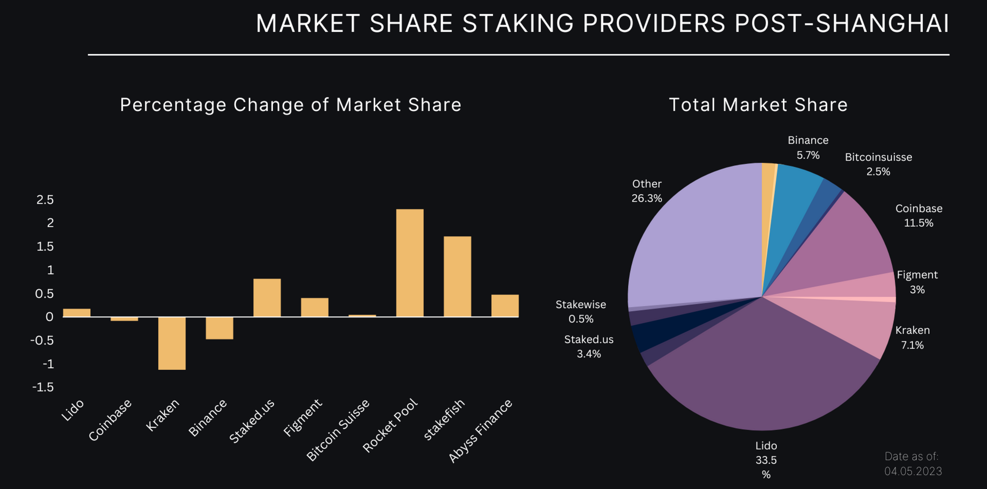 Bất chấp sự gia tăng hoạt động xung quanh các validator mới tham gia và rời đi, thành phần tổng hợp của Staking Pool hầu như không thay đổi. Kraken, nhà cung cấp dịch vụ staking có nhiều validator thoát nhất, chỉ giảm tổng số cổ phần của mình xuống 1.1%, trong khi Binance giảm khoảng 0.5%. Rocket Pool tăng nhiều nhất với 2.3% và Stakefish tăng 1.7%.