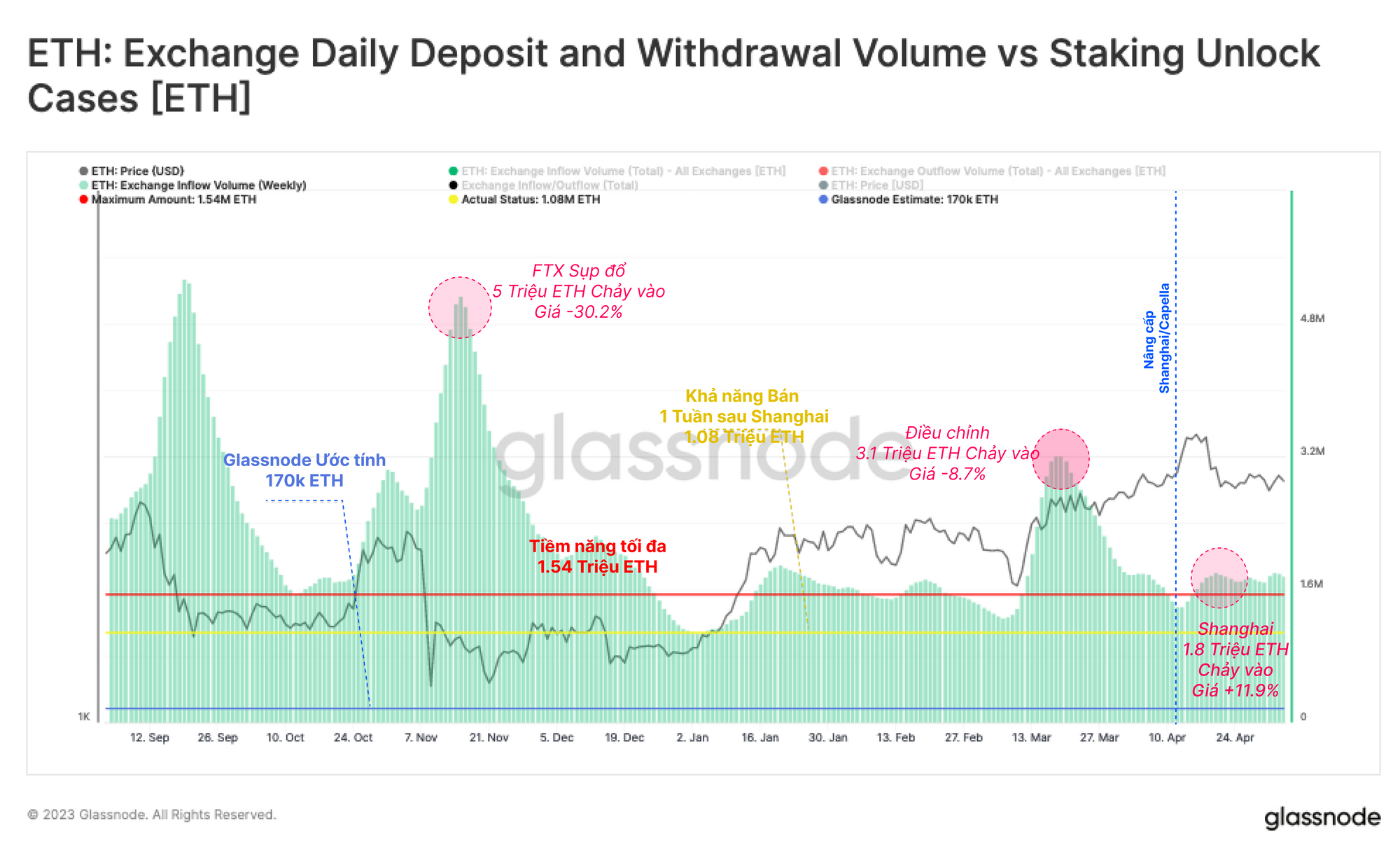 Khi kiểm tra số lượng cổ phần đã rút này thực sự đã được bán ra bao nhiêu, chúng tôi có thể tham khảo dòng tiền vào sàn giao dịch trung bình hàng tuần trong cùng khoảng thời gian. Chúng ta có thể thấy rằng không có sự gia tăng đáng kể nào về khối lượng, với dòng tiền vào sàn giao dịch lên tới 1.8 triệu ETH trong bảy ngày đầu tiên sau đợt nâng cấp. Những con số này nhỏ hơn nhiều so với các sự kiện bán lớn khác trong quá khứ và rất phù hợp với các mô hình dòng tiền vào điển hình.