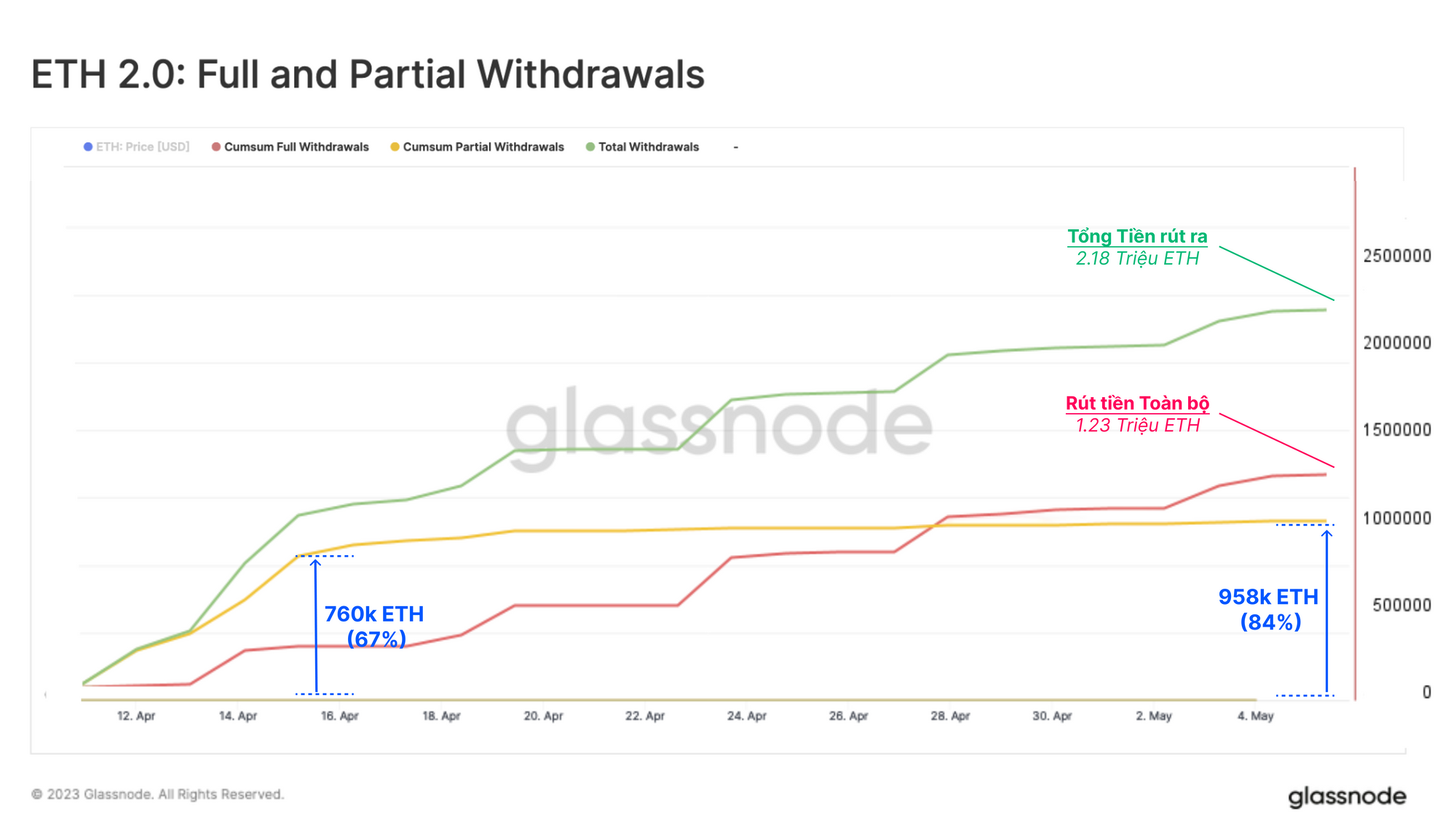 Sau nâng cấp, nhu cầu thoát ngay lập tức đạt mức tối đa, với số lượng rút giới hạn ở mức 57,600 ETH. Kể từ ngày 28 tháng 4, tổng lượng cổ phần đã rút ra đã vượt quá số phần thưởng đã rút. Đây là một sự phát triển thú vị, vì nhiều phân tích tập trung chủ yếu vào phần thưởng staking như là tác nhân chính của áp lực bán ETH. Tuy nhiên, việc rút tiền toàn bộ đã phần nào chiếm ưu thế khi xét về khối lượng được unstake.