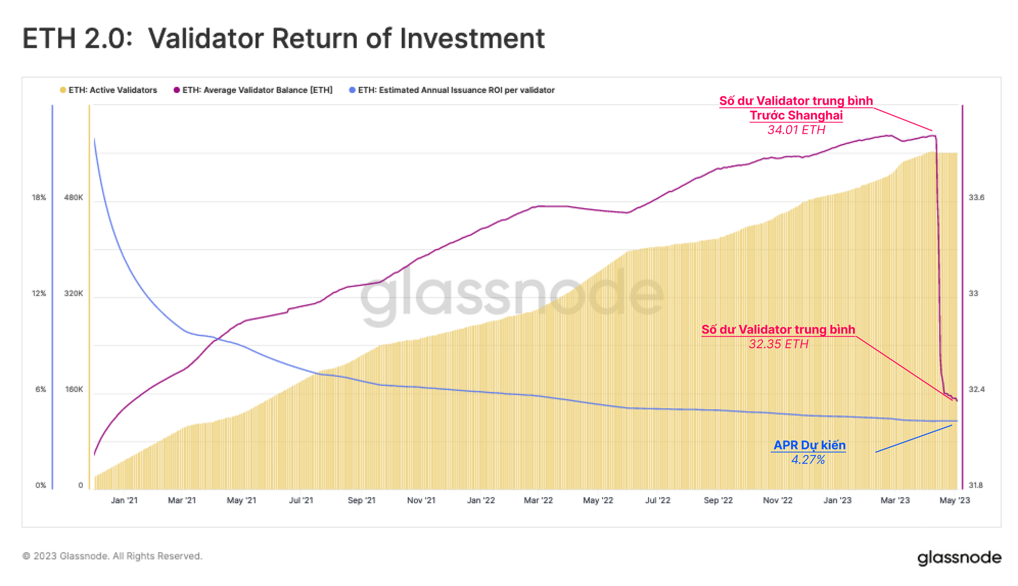 Tỷ suất lợi nhuận ước tính hàng năm (APR) cho các validator có tương quan nghịch với số lượng validator đang hoạt động. Với 561,000 validator hiện có trong pool, APR ước tính là 4.27%.