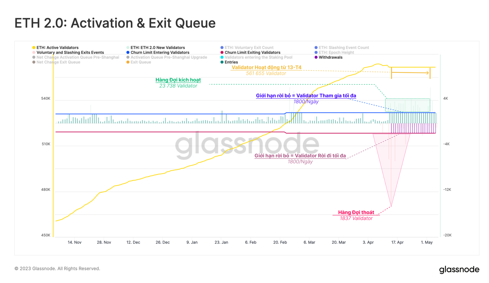 Ở phía bên kia của phương trình, chúng tôi thấy hơn 23,000 validator đang xếp hàng chờ để được tham gia staking, trong khi hàng đợi thoát pool đã giảm xuống chỉ còn 1,837. Chúng tôi thấy rằng các sự kiện thoát được bù đắp bằng các validator tham gia mới, dẫn đến không có thay đổi ròng nào trong số lượng validator đang hoạt động.