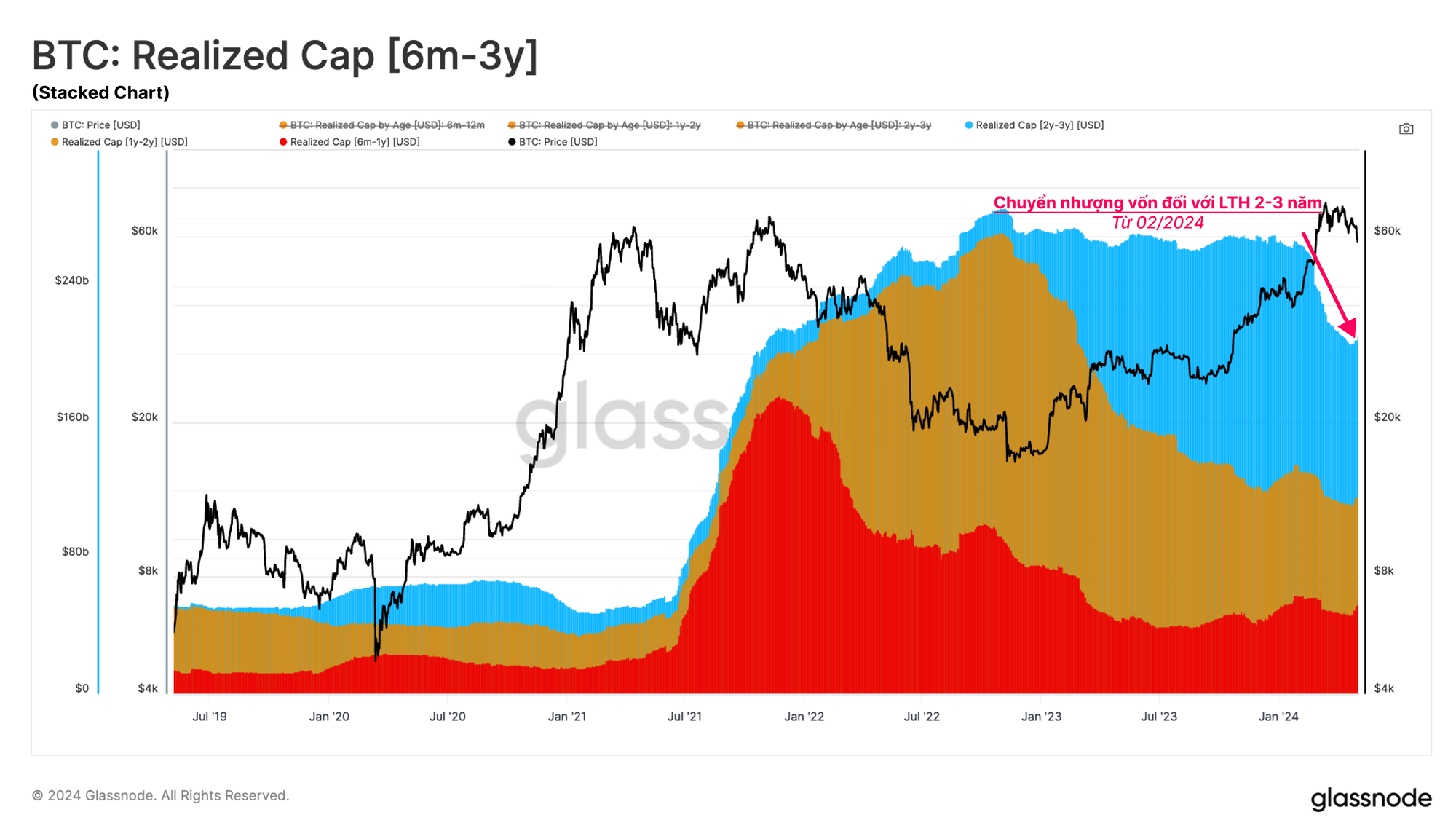 Điều này có thể bị ảnh hưởng bởi sự chấp thuận các quỹ ETF, với một tỷ lệ thoái vốn đáng kể xảy ra vào tháng 2 năm 2024, khi thị trường phục hồi và khoảng một tháng trước khi BTC đạt ATH 73.000 USD. Trong lịch sử, những Người nắm giữ dài hạn này thường chờ đợi dòng cầu mạnh mẽ để chốt lời.